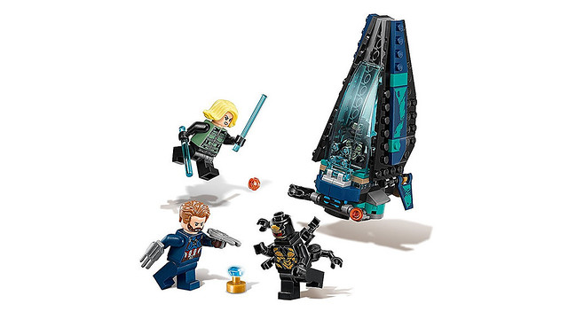 首先登場的是這波盒組中最小的一組,定位就像是入門包,可是裡頭的人偶卻包含了兩個全新造型的英雄角色,長著大鬍子、拿著瓦干達特製盾牌的美國隊長和白色頭髮、緊握短棒的黑寡婦,以及兩個反派「Outrider」,Outrider 是薩諾斯黑暗教團裡的先鋒隊,他們是人造的基因工程產物,不止體格高大而且具備殺戮的本能,載具則是Outrider 的小型飛船,還附上其中一顆無限寶石喔。
