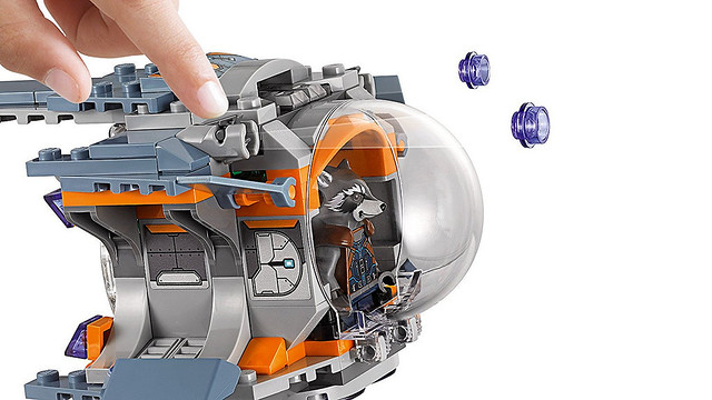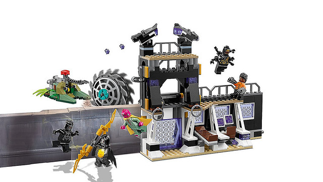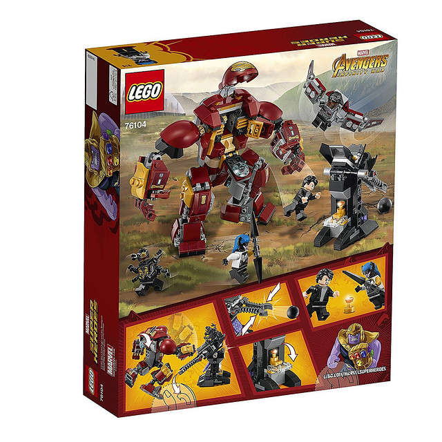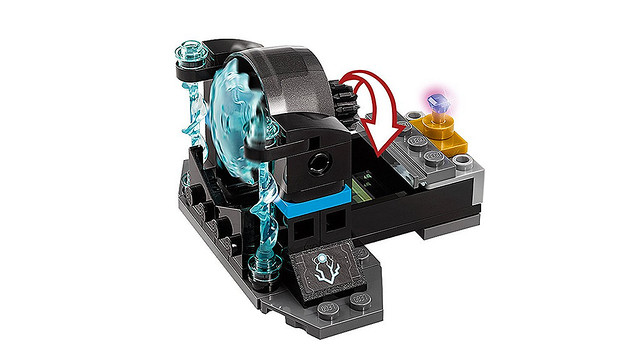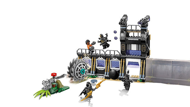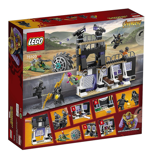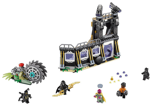 場景回到地球的瓦干達,這組的英雄人偶有黑豹、大人氣的妹妹「舒莉」和幻視,反派則是一隻Outrider,和黑暗教團中最善戰的「亡刃」(Corvus Glaive),拿著類似鐮刀的大型武器登場!只要亡刃握著他的武器,他就擁有長生不死的能力;場景則是造型奇特、具備有趣機關的瓦干達城牆,內部則是實驗室(有可能就是舒莉的實驗室),另外,還有一個「Thresher」,Thresher 有脫粒機的意思,在官方的資料中,反派會利用這台機器來攻擊城牆,由於是關於農作物的相關機器,小編推測有可能是瓦干達本地的機械,可以發射帶有刀刃的巨大齒輪,這組也包含一顆無限寶石!