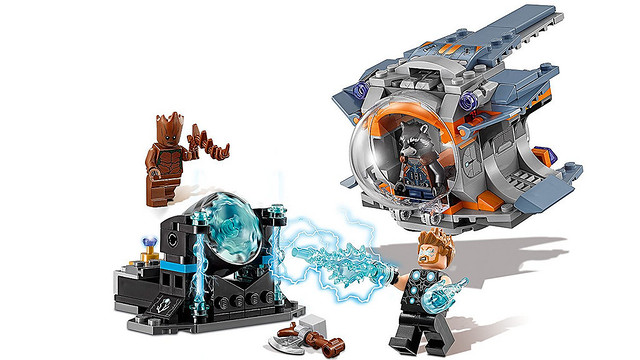 再來,第二款盒組來到了太空,人偶陣容同樣令人興奮,包含了短髮索爾(還有雙眼發光的臉)、火箭、新規造型的青少年格魯特,值得一提的是也曝光了索爾的新武器,由雷神之槌碎片、格魯特手臂所鍛造的半槌半斧新武器「Stormbreaker」;另外還有一個逃生艙,以及小型太空站場景(不確定是不是預告中出現的太空站),還附有大量的特效零件可以給索爾使用,這組也包含一顆無限寶石!