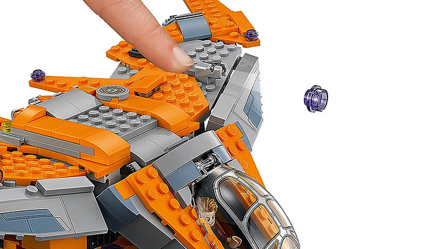 終於,薩諾斯的人偶在這組登場啦~而且還拿著一把巨大的刀型武器,除了這位大一號的瘋狂泰坦之外,英雄人偶包含星爵、葛摩菈,跟身穿馬克50 戰甲的鋼鐵人,那巨大的飛翼結構也太帥了吧!而且還可以加上許多特效件,看起來應該是卯足全力在對抗薩諾斯;載具是一台橘色的中型飛船,除此之外,還有超霸氣的無限手套跟支架,不但可以把手套戴在薩諾斯手上,手套是真的可以拆卸無限寶石,也就是說,如果你是個跟小編一樣很孤單的樂高迷,就必須收完前面全部的盒組,這樣無限手套上才會有滿滿的寶石喔XD~這組也包含一顆無限寶石!