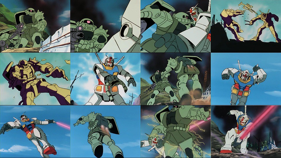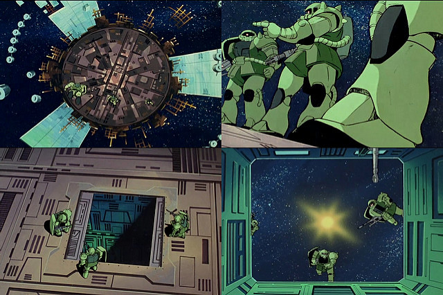 ▼ 初代鋼彈動畫第一話的薩克 ZAKU 初登場:綠色、單眼、規格化,建立起後來機器人動畫中的量產機基本形象。