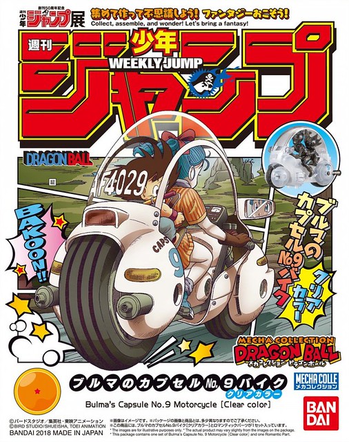 這次限定的第一卷"布馬的9號膠囊機車"將系列推出過的膠件料更改為「透明膠料」,另外包裝盒繪上面也增加有這次"週刊少年JUMP"的字樣以及設計編排上部份更改等等,此作預計於2018年3月19日〜2018年6月17日期間在JUMP創刊50週年紀念的"週刊少年JUMP展 Vol.2會場"限定販售,喜愛《七龍珠》系列的玩具人可以參考一下歐!