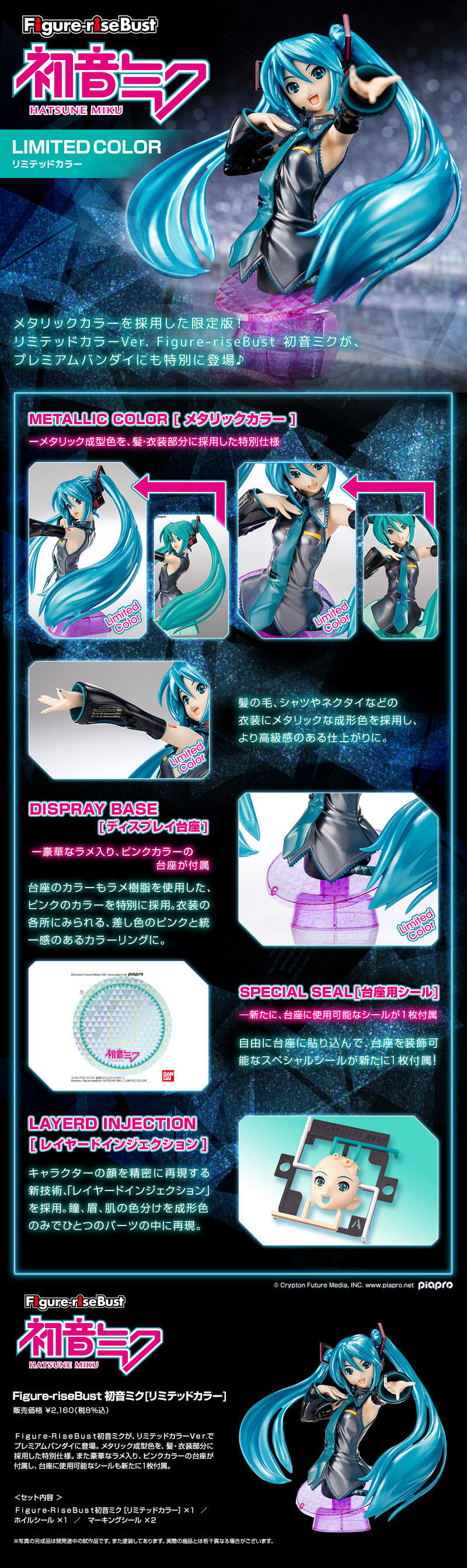 由日本BANDAI萬代玩具公司發行,將人物半身像透過組裝模型形式精緻再現的「Figure-rise Bust」系列宣佈,曾在今年「Wonder Festival 2018[冬]」會場限定販售的人氣商品「Figure-riseBust 初音未來[限定配色]」決定再次生產,並於線上商店「Premium BANDAI」限定販售,預計 2018 年 05 月出貨。