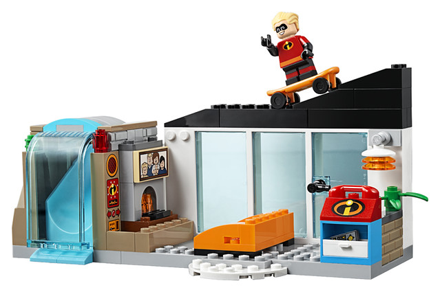 這組的場景來到超人一家的房子,不但巴小倩、巴小飛、巴小傑一起登場,還附屬了他們的專屬配件歐~像是巴小倩的超能防護盾、巴小飛的橘色滑板,以及把小傑包覆起來的半透明橘色火球,客廳的場景還有許多細節呢!熱線電話、全家福照片都非常可愛,外頭還有滑水道與游泳池;反派則是開著車子的新角色「Brick」,車子還搭配簡單的投石裝置。