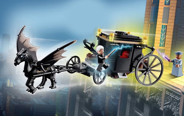 「LEGO 怪獸與葛林戴華德逃脫」作為新電影的首款盒組確實相當吸引人,不但有強尼·戴普飾演的「葛林戴華德」白髮人偶,再來就是最搶眼的飛馬怪獸「騎士墜鬼馬」(Thestral),一身漆黑的身體有著骨骼般的形狀,再加上兩片彷彿龍翼一般的翅膀十分帥氣,另外,還有在《怪獸與牠們的產地》中登場的美國魔法國會首長「拉菲娜·皮奎里」(Seraphina Picquery)人偶,兩人都附有魔法特效零件跟可以呈現各種角度的魔杖配件,馬車的形狀也頗為精緻歐~!