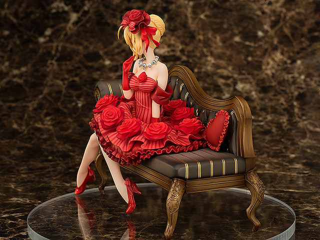 雖然旗下還有正統派偶像「間桐櫻」、農園系男子團體「YARIO」、偽娘系偶像「阿斯托爾福」,不過還是身為社長的偶像皇帝「尼祿」才是事務所的焦點呀!這次「偶像皇帝/尼祿 1/7比例模型」就是以社長自豪的宣傳照為原型立體化,豔紅的洋裝宛如猛烈綻放的薔薇散發出熱情,華麗的緞帶、珍珠項鍊、花朵也極具質感,襯托出尼祿的美麗與高貴氣息,底座的沙發則有真實的木紋與雕刻,古色古香。姑且不論歌喉,十項全能(自稱)的尼祿社長只要不出專輯就一定能持續紅下去!
