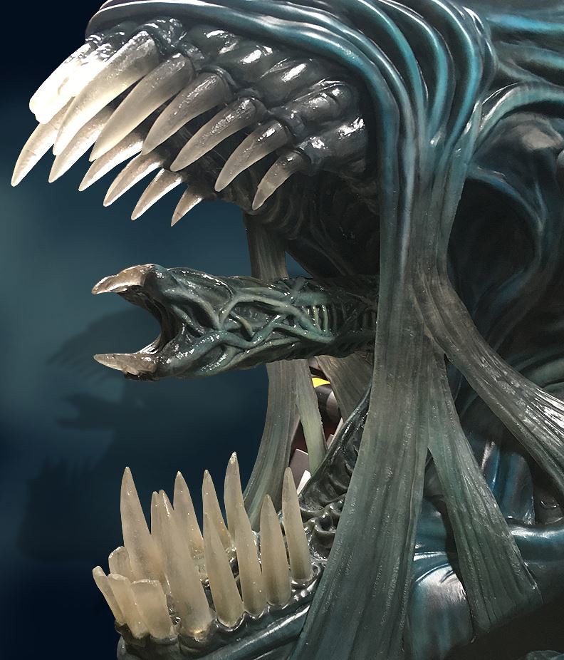 「異形女王 1:1 比例壁雕」高達93.9 公分,將異形女王掙扎的可怕樣貌完整重現,極致的造型刻畫、精彩的手工上色讓異形女王的皮膚紋理更加逼真,細長的手指也極具生物感,佈滿尖牙的嘴巴實在好嚇人啊~黑色背景讓人能有進一步的想像空間,精緻的場景也施以寫實的舊化處理;另外,HCG 限定版還追加了一個伸長的「內嘴」(Inner Mouth)可以替換,收藏價值再提升,也讓這款作品展示起來更加嚇人阿~!