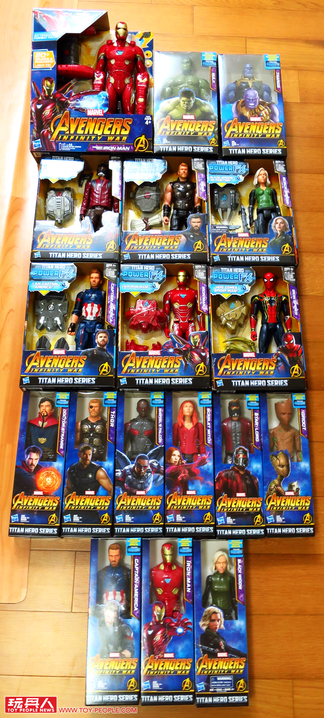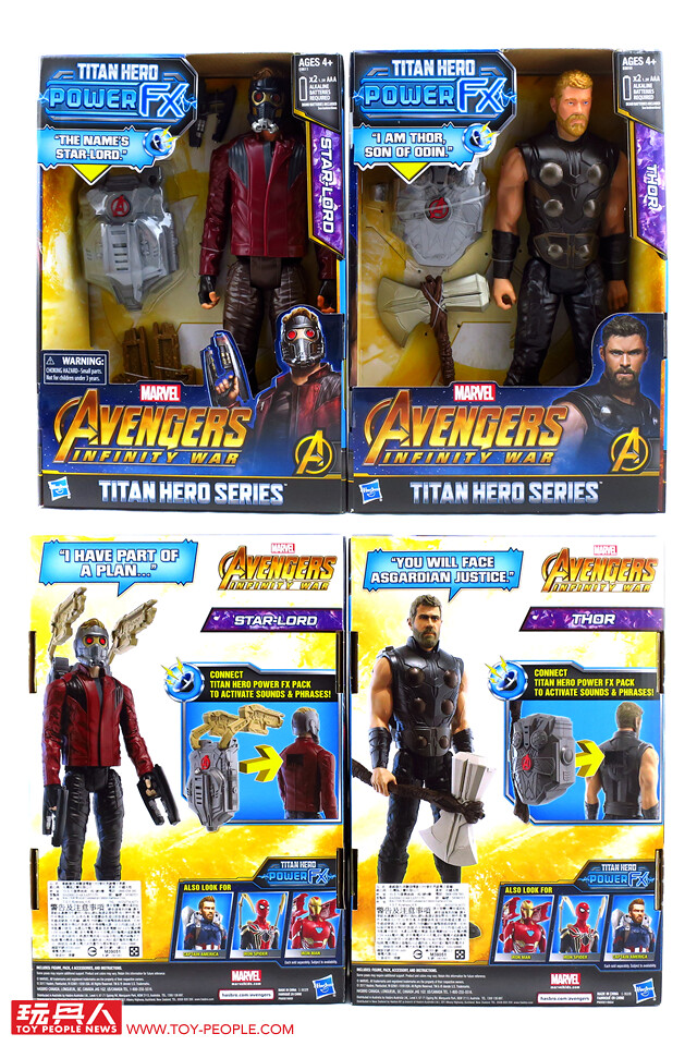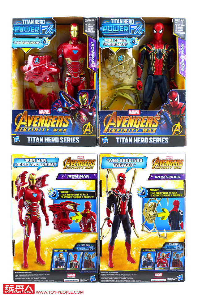 繼早前我們所分享過的系列產品「收藏型無限手套」、「漫威傳奇系列6吋人物組」、「鋼鐵人擴增實境面具Hero Vision」等等,孩之寶也同時推出了主打孩童向的12吋可動人偶「泰坦英雄系列(Titan Hero Series)」,以及大型的電子版「MISSION TECH鋼鐵人」。泰坦英雄人物組是以較大的12吋尺寸收錄電影中的眾多要角,具備了基本的可動設計,以及豐富的造型刻劃,本次的泰坦英雄們更加入了全新的「POWER FX」背包系統,不僅可以讓人偶發出音效、唸出經典台詞,也能經由裝備的交換再現角色的聲音效果,連動遊玩的高度樂趣絕對不容小覷!