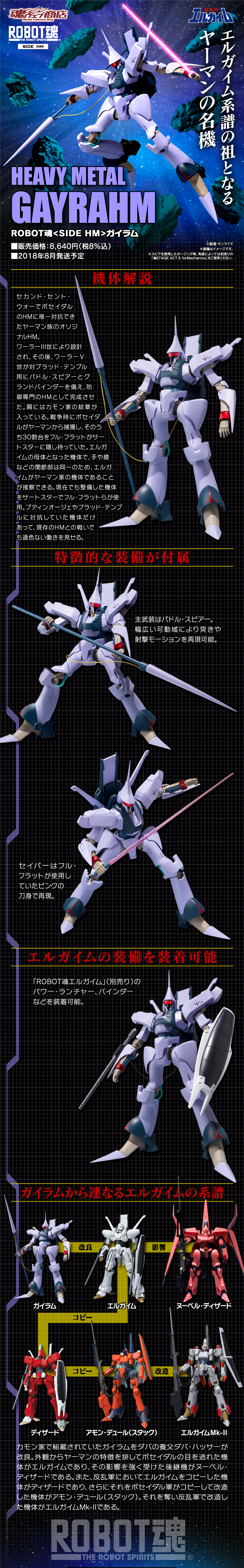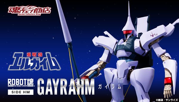 劇中是"重戰機(エルガイム)"原型機體的「GAYRAHM」這次將以ROBOT魂可動系列來呈現,作品附有交換用右手首3種、交換用左手首2種、陸地移動推進器、武器矛、佩刀×2、備用電纜以及天線(備用)等等豐富配件,讓玩家輕鬆在現各式劇中激戰畫面,此作品預計於Premium BANDAI線上商店在2018年3月16日開始接受訂購,喜歡《重戰機》動畫系列的玩具人可以參考一下歐!