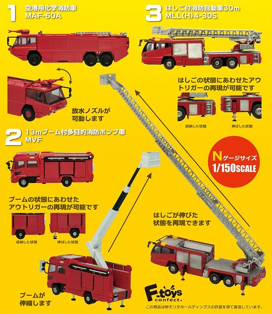 專門推出盒玩作品的F-TOYS玩具公司之前與日本的消防車輛共同合作,已經推出過「日本消防車輛1」後頗受到喜愛小車玩具人們的好評,這次將繼續推出其「第二彈」系列的續作盒玩,這次將推出「機場用化學消防車MAF-60A(空港用化学消防車MAF-60A)」和「13公尺多功能的消防幫浦車MVF(13mブーム付多目的消防ポンプ車MVF)」以及「附梯子消防自動車30mMLL(はしご付消防自動車30mMLL)」等等三種類。