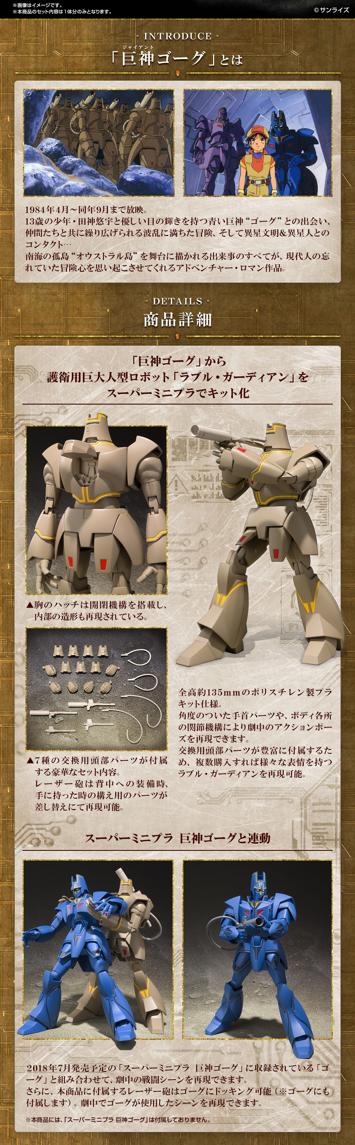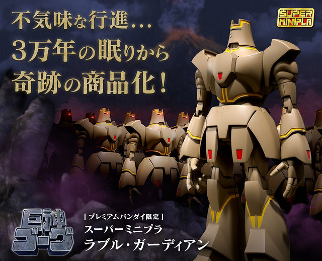 日BANDAI萬代玩具公司食玩部門事業部們以成熟年齡為對象的「超級迷你盒玩」(スーパーミニプラ/SUPER MINIPLA)系列,才公開以早期動畫作品《巨神GORG》為題材的「巨神GORG」盒玩作品,同時間也將推出護衛用土黃色的機體「沙普魯・高古依(ラブル・ガーディアン)」(名稱暫譯),此次作品附有多達約7種的交換用頭部配件,還原劇中以大量軍隊複數攻擊的設定,此作預計將於PREMIUM BANDAI在2018年3月16日開始接受訂購,喜愛《巨神GORG》動畫的玩具人千萬別錯過了歐!