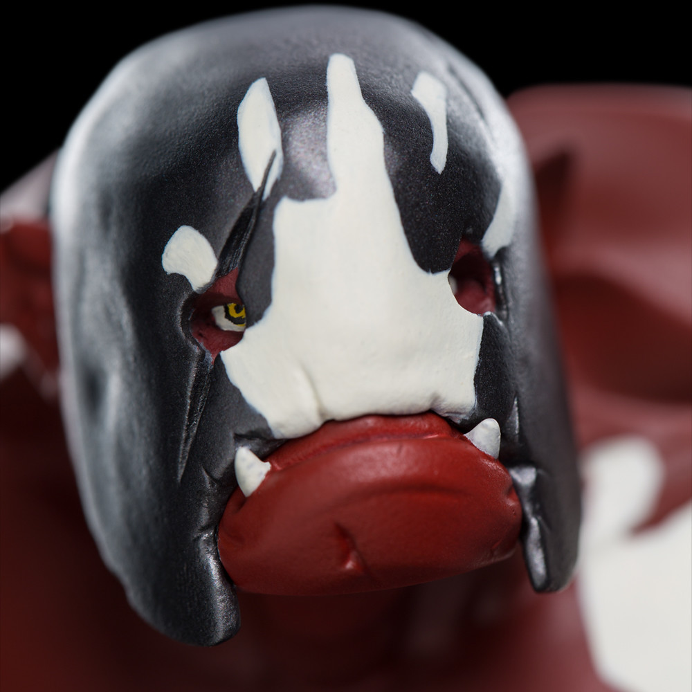 雖然Q 版的造型設計去除了半獸人臉上令人害怕的潰爛皮膚和傷疤,但是本作仍然藉由強烈的表情、扭曲的臉龐、張力十足的動作,展現出半獸人邪惡的氣息,鐵黑的深色裝甲有著不亞於金靂裝備的造型細節,值得一提的是,不同角度即可看到護甲穿戴的構造,雖然是反派但魅力十足。