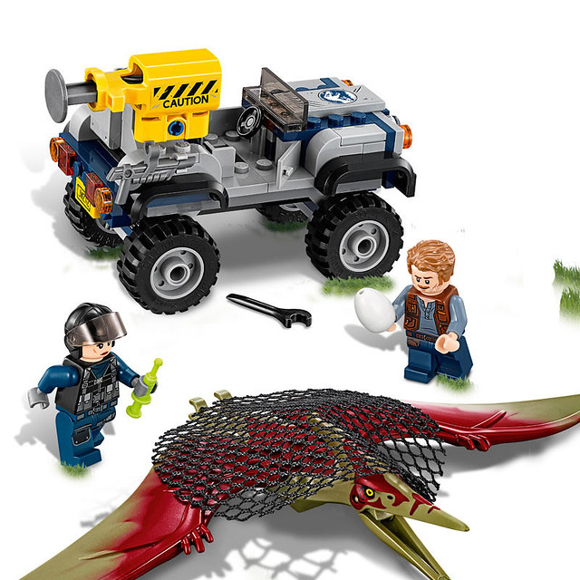 首先看到的是這波盒組中最小的,跟《侏羅紀世界》電影盒組一樣,入門款的類型盒組都是收錄翼手龍,人偶部分則是歐文與一位女性Tracker,吉普車的外型稍嫌陽春,但配備了跟「城市系列 高山警察」一樣的網子發射裝置增加可玩性,可以趁歐文用恐龍蛋吸引翼手龍時,用圓形的網子加以捕捉。