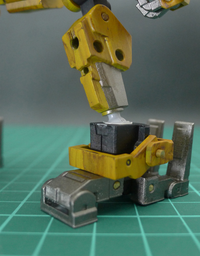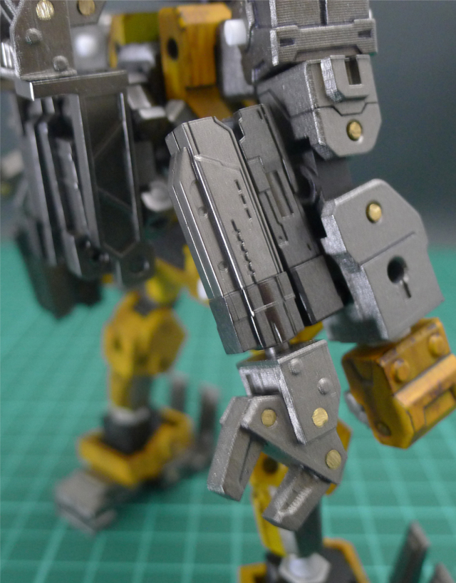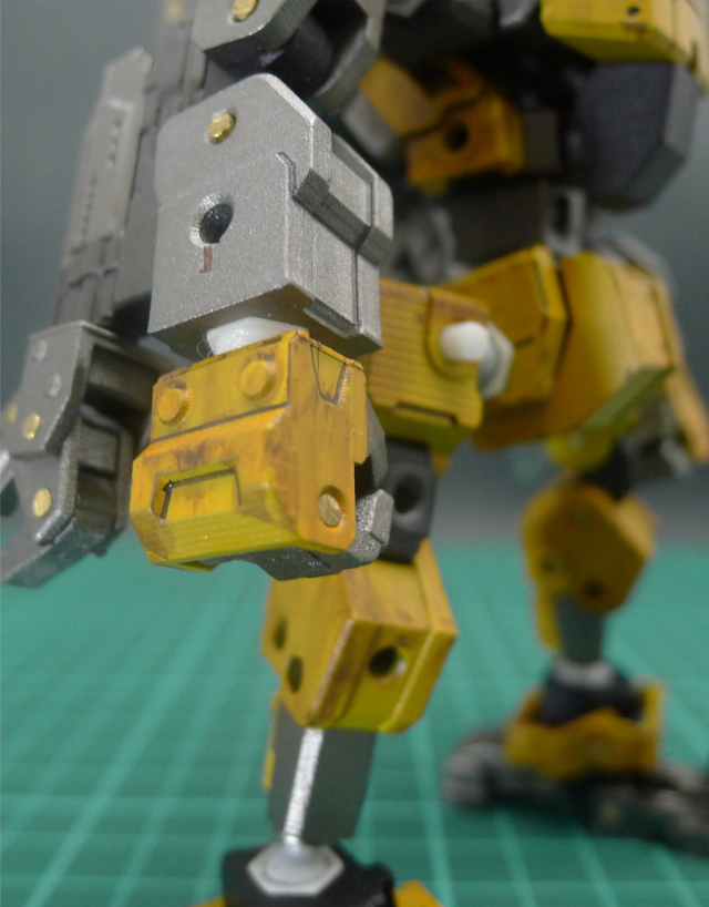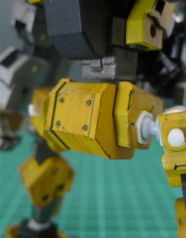 最後是一些漬洗上的細節,我想表現出這個機體在作業現場的風塵味,所以用了TAMIYA的XF-10搭配ZIPPO打火機油作刷洗,表現流鏽的質感;