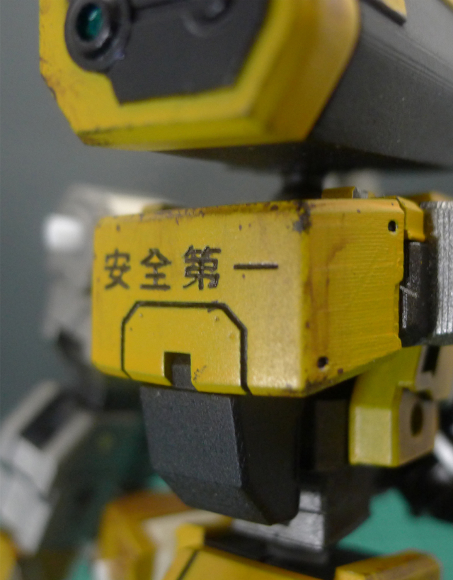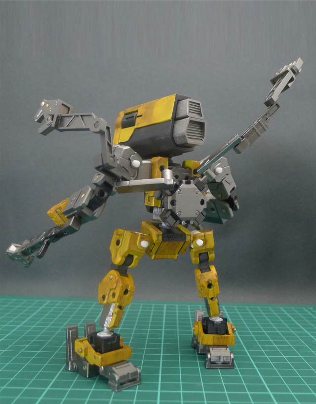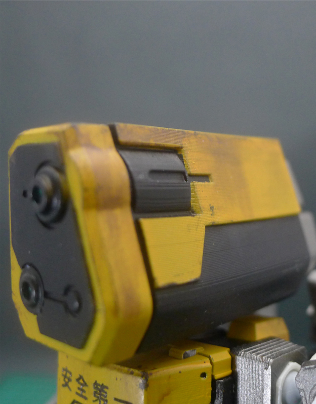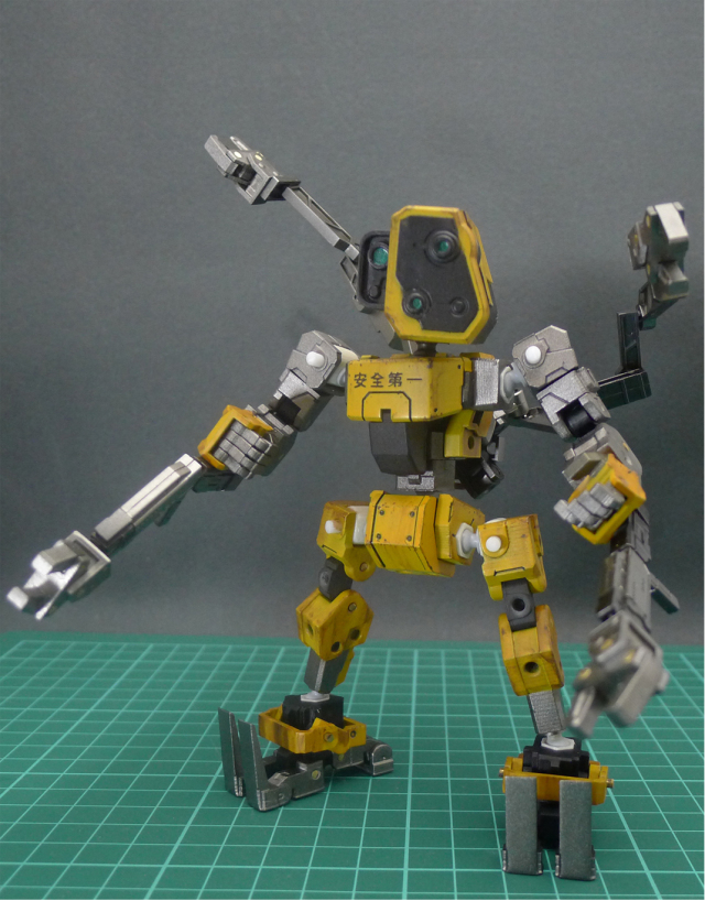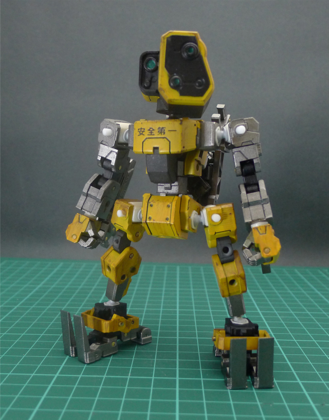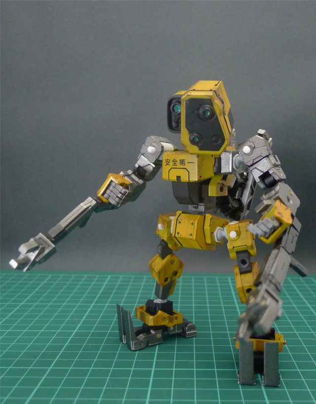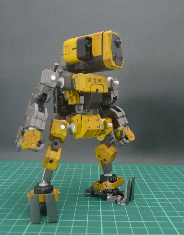 這個作品採用了光固化的成型方式製作,整體採用了三頭身的比例,由於機體是設定為工程用的,所以在配色上面用了一般建築重型機械的配色,頭部採用像是一般監視器的外型,讓整體的感覺有機械跟工程感;
