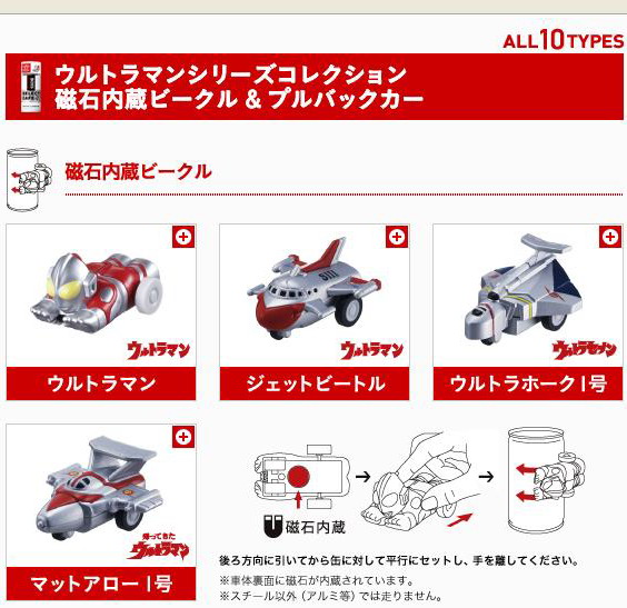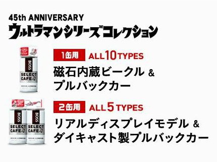 BOSS在日本可說是罐裝咖啡的超級品牌,品牌旗下「SELECT CAFE」於9/13與超人力霸王45週年企畫結合,推出一系列飲料贈品,凡購買一罐BOSS咖啡,其鐵罐上會組合包裝一台超人力霸王影集中出現的經典車輛模型,一共10款。如果購買兩罐組合包裝,則有另外5款贈品可供選擇。特別值得一提的是這小車中有4款內含磁鐵,可以吸附在罐裝BOSS咖啡上,吸附後往後拉動小車機關,放開就可以看到小車在鐵罐上環繞奔跑的新奇玩法,可說是創意十足!看來日本的超人力霸王迷要喝咖啡喝到頭痛囉!近期有去日本的玩具人可別錯過!