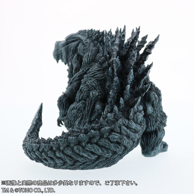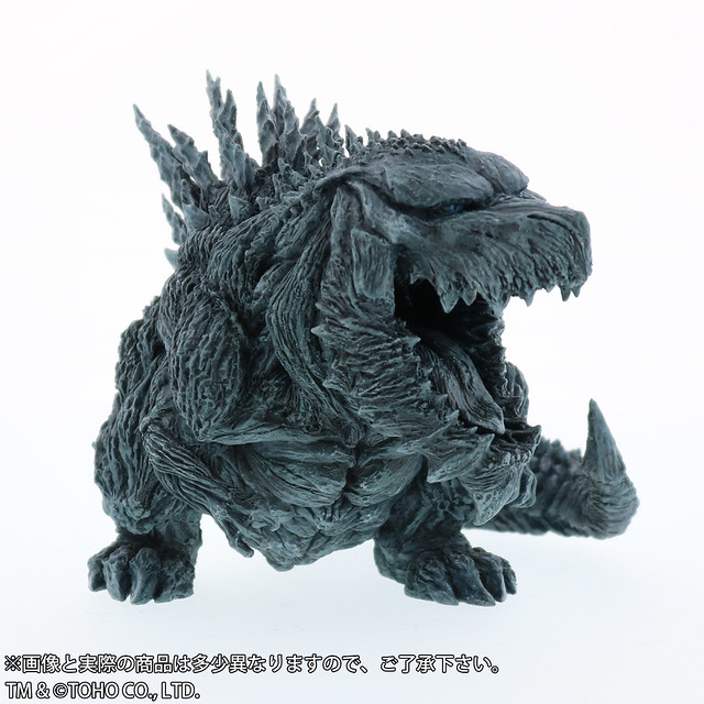 這次「Q版擬真系列」推出的動畫版哥吉拉將全高超過 300 公尺的怪獸王透過 SD 造型呈現,2頭身左右的比例看起來相當可愛,卻也同時保留了擬真的皮膚細節以及極具份量的身軀,不論是複雜的纖維紋理或背鰭的堅硬質地,都透過多層次的塗裝更顯立體。配合張開大嘴的咆哮姿態,讓這隻哥吉拉同時兼具霸氣的一面!而少年RIC限定版更在背鰭處裝設LED燈,可再現發射熱線時閃爍藍光的背鰭!