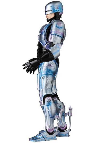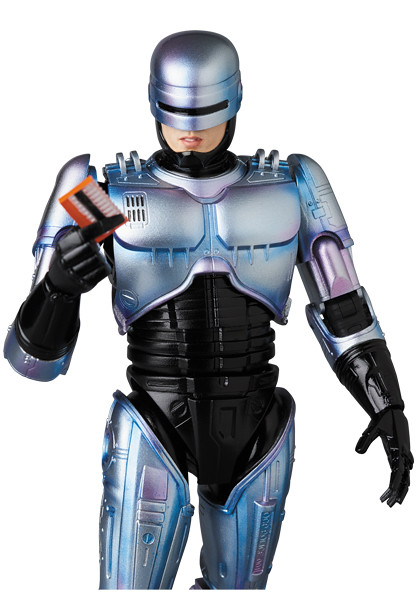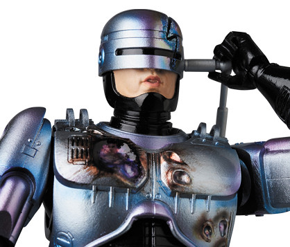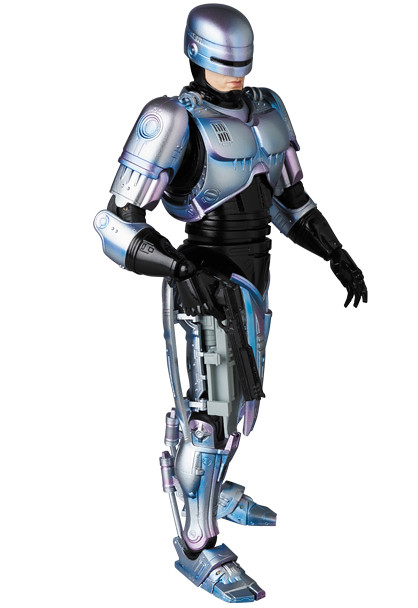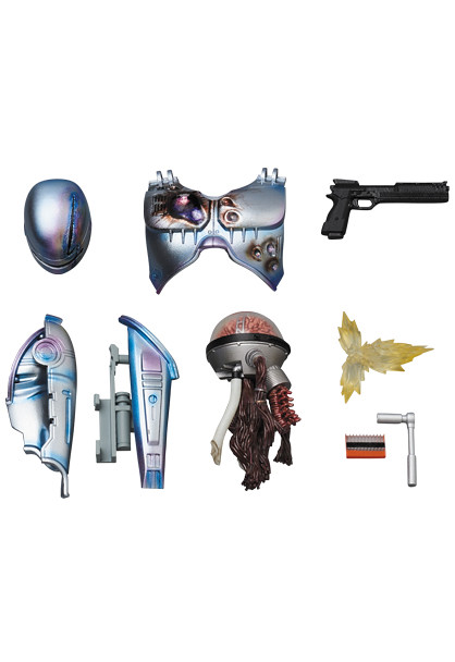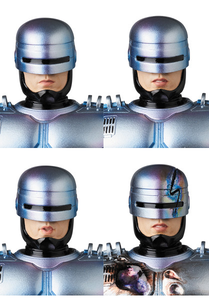 「MAFEX 機器戰警」高約16 公分,逼真地再現了電影中的外型,與1987年的版本相比,盔甲的顏色偏藍,並帶有紫色的光澤,漸層塗裝所營造出的視覺效果相當精彩,除了有三種替換嘴型之外,配件部分包含了經過戰損處理的頭盔、胸甲,右腿也能再現收納Auto9 手槍的模樣,或是將手槍搭配擊發時的特效零件也超帥啊!另外,還附屬了包含機械腦的多個配件,讓你輕鬆重現片中的經典場面歐~