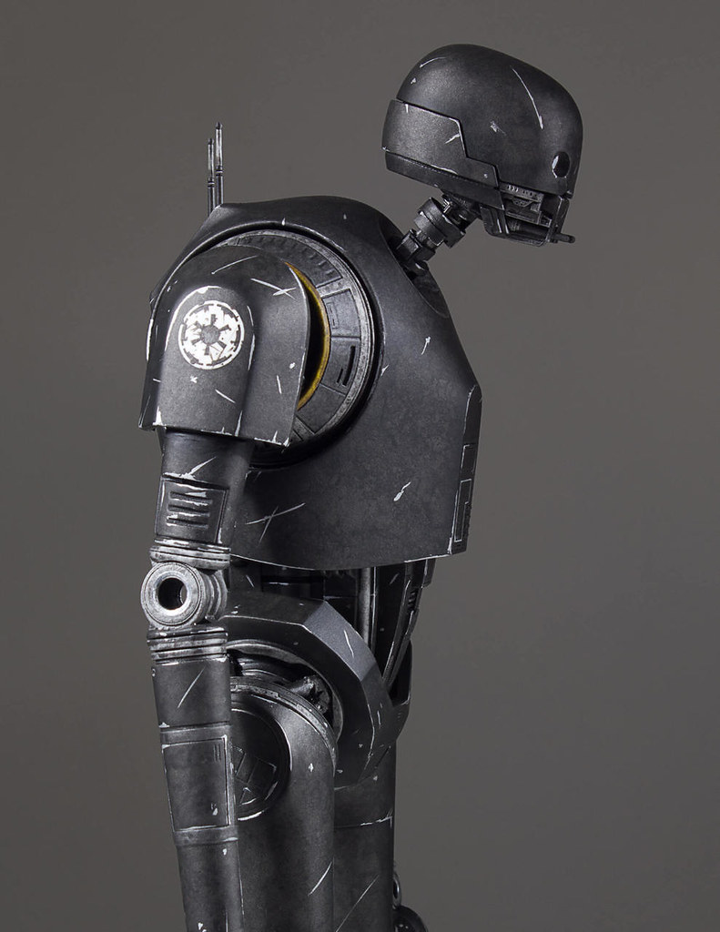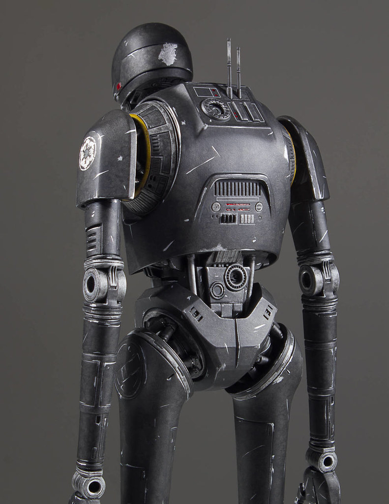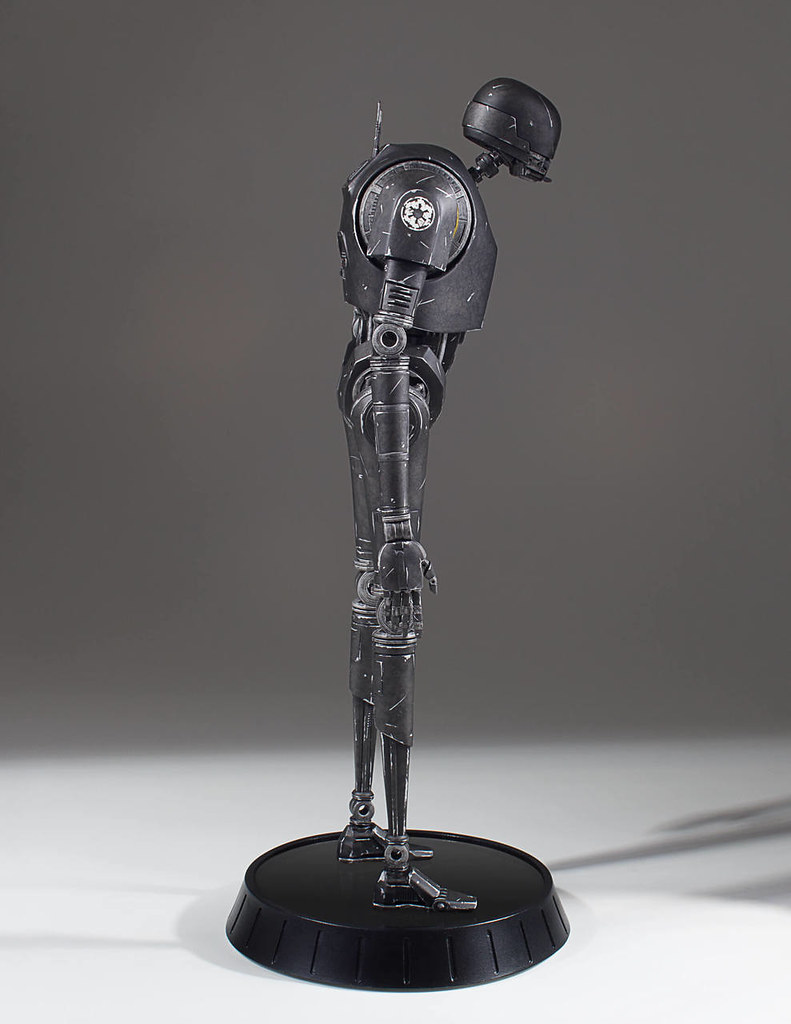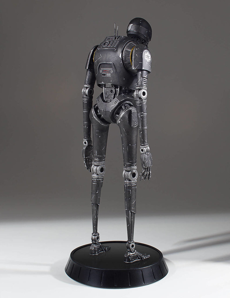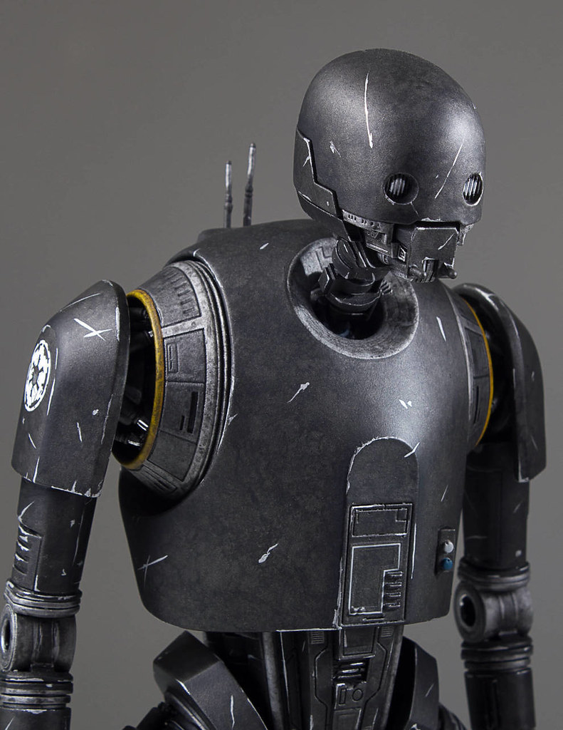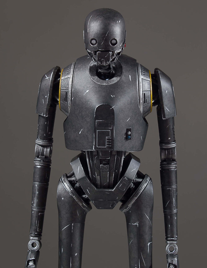 「K-2SO 1/6 比例全身雕像」根據電影的原始道具和3D 資料,將K-2SO 在劇中的樣貌完整重現,霧黑的金屬塗裝極具質感,大量的機械造型細節使人大呼過癮,零件接合處的活塞閥、裝置、按鈕等等都考究地還原,從頭到腳皆施以精緻的舊化戰損,刮痕、髒污,以及肩膀上脫漆的帝國標誌都相當寫實,傷痕累累的模樣也帶出了K-2SO 迷人的背景設定。