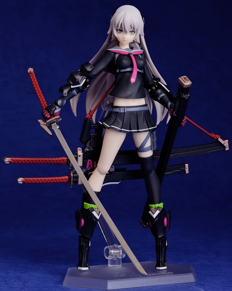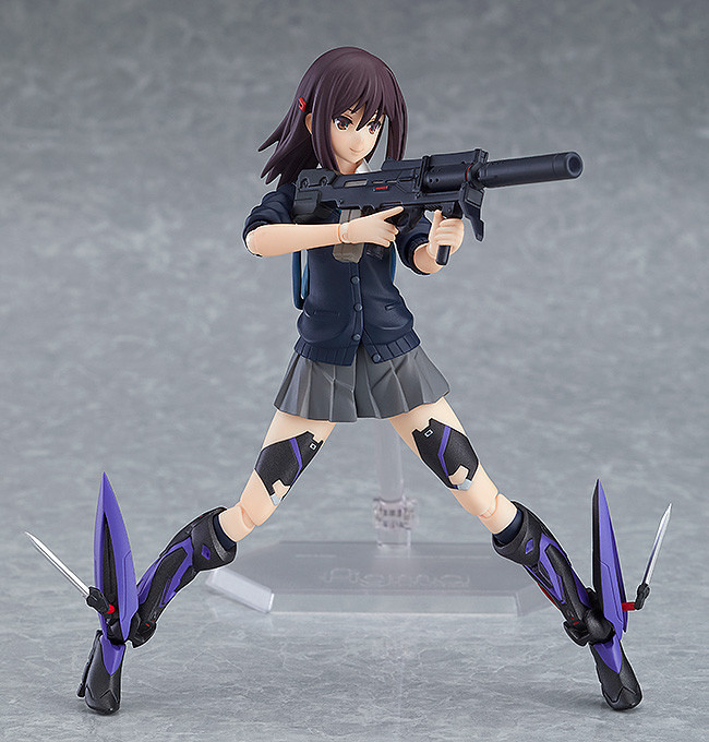 「figma 仿生女高中生」忠實再現了深井涼介老師的設定,表情附上「張嘴笑臉」、「微笑臉」和「驚訝臉」三種,背包、制服等服裝配件也相當還原,仿生鞋更用厚重的金屬色塗裝,質感極佳。透過軟材質製作的裙子可減少了腿部干涉,配合「步槍」、「手槍」、「震撼彈」、「替換用彈匣」多種武裝能把玩出帥氣的戰鬥場面,步槍的抑制器、彈匣可卸下,仿生鞋也能裝上刀片!當然還有現實或虛構世界的JK都必須要有的「手機」。