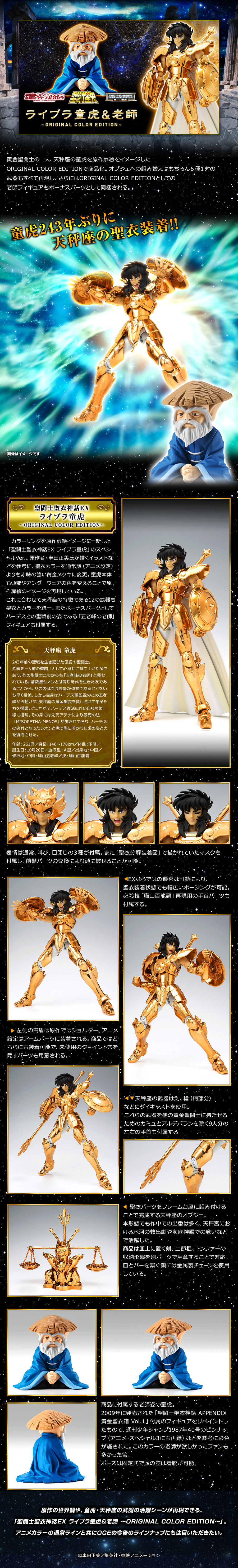 天秤座童虎在聖闘士星矢的故事設定當中是"天龍座 紫龍"的師傅,同時他也是雅典娜最信任的黃金十二星座聖闘士之一,這次以原作漫畫扉頁所繪製的配色來呈現,附有交換用手首左右4種、交換用表情配件2種、交換用髪の毛配件以及多款可以對應系列豐富的武器配件,這次還附有ORIGINAL COLOR版本年老的童虎,此作預計將於Premium BANDAI線上商店在2018年3月30日開始接受訂購,喜愛聖闘士聖衣神話EX系列的玩具人可以參考一下歐!