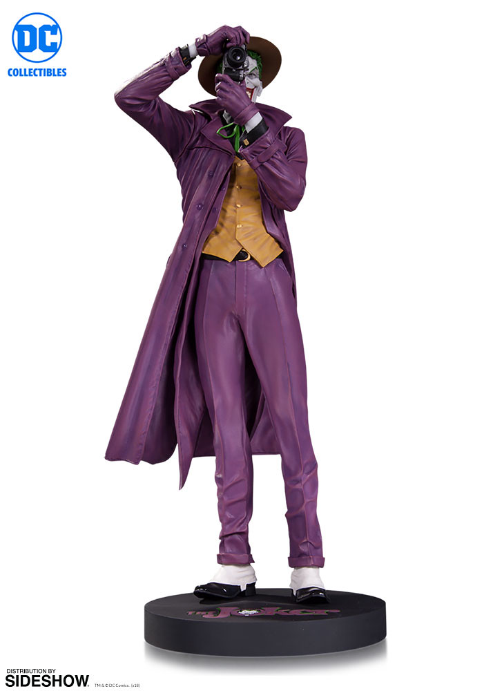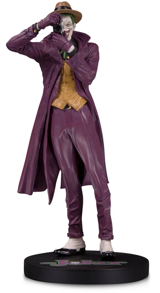 DC Collectibles 在去年就已經推出過這款經典的小丑雕像了,當時是以34.7 公分高的尺寸、150 美元的價格來推出,而這次的迷你版則是高約18.7 公分,雖然尺寸縮水,但那令人不寒而慄的笑容所傳達出的詭異氛圍可是絲毫未減啊!蒼白的皮膚、綠髮、雙手持有相機的姿勢,笑開懷的嘴巴露出兩排整齊的牙齒,這些細節都被雕刻師David Giraud 以精湛的工藝栩栩如生地展現,紫色大衣、西裝褲也有寫實的皺褶造型,加上印有「The Joker」字樣的底座,絕對是小丑迷不可錯過的雕像傑作~~!