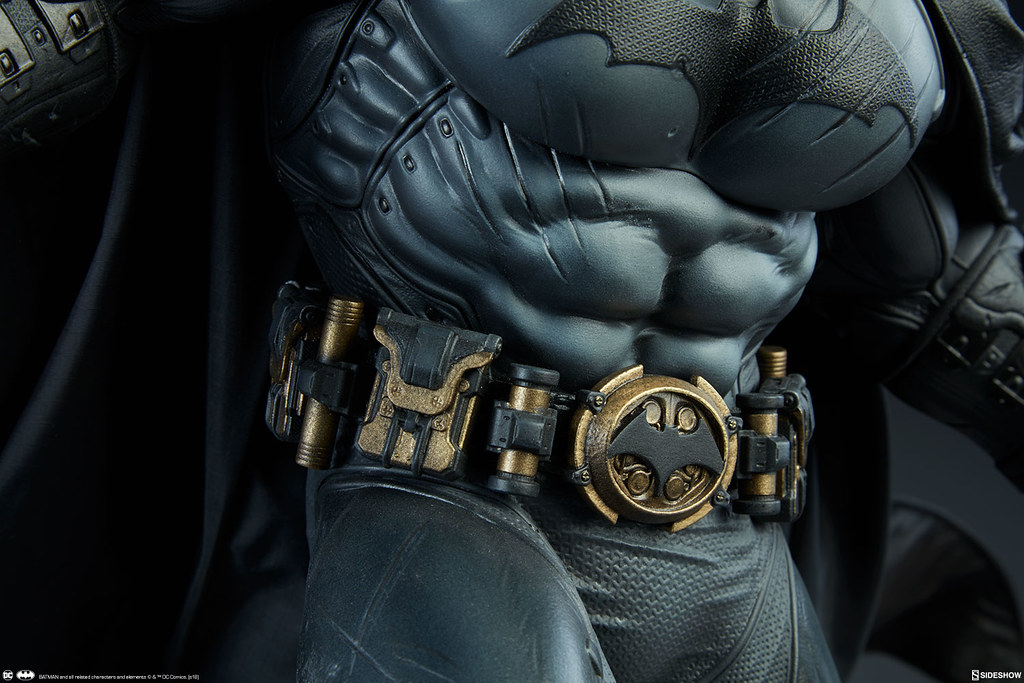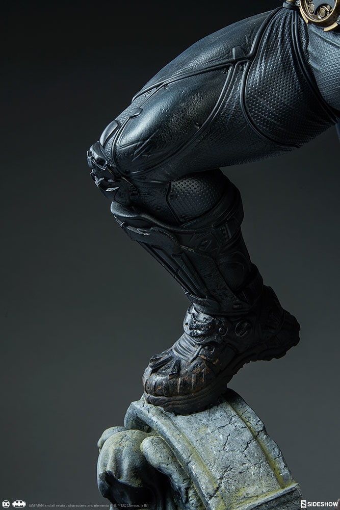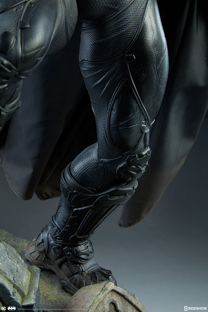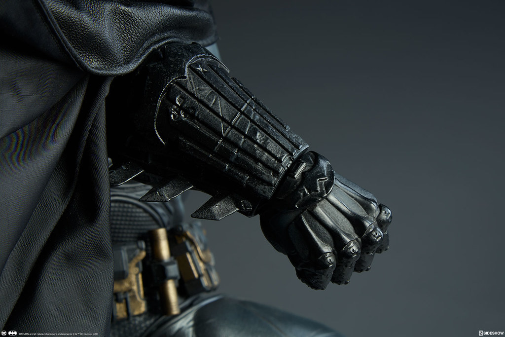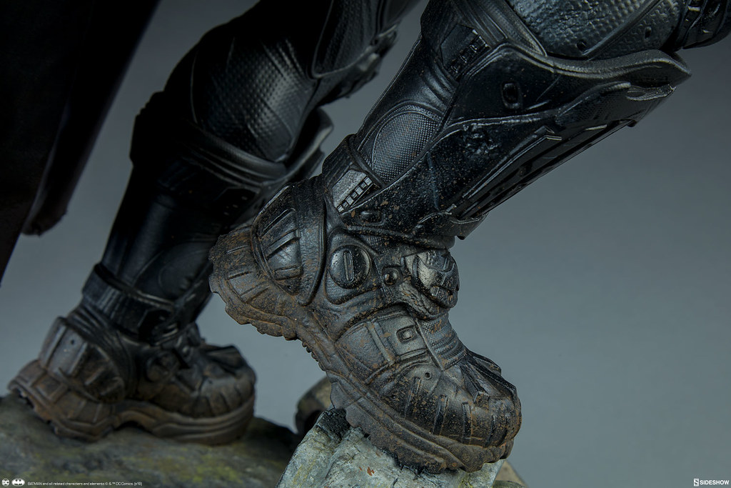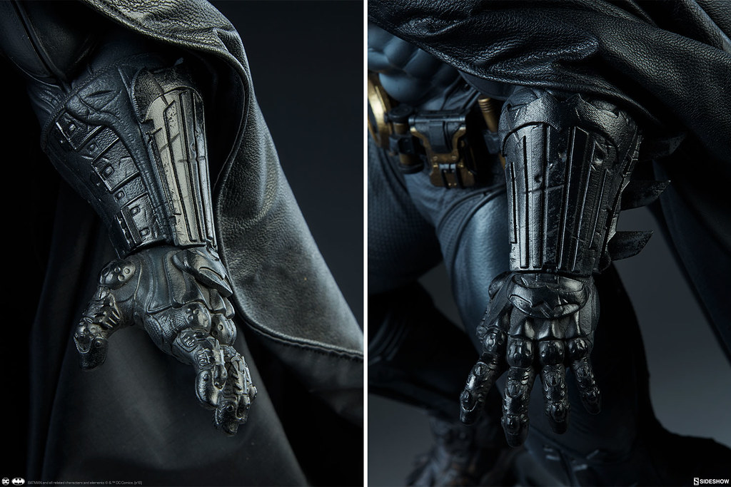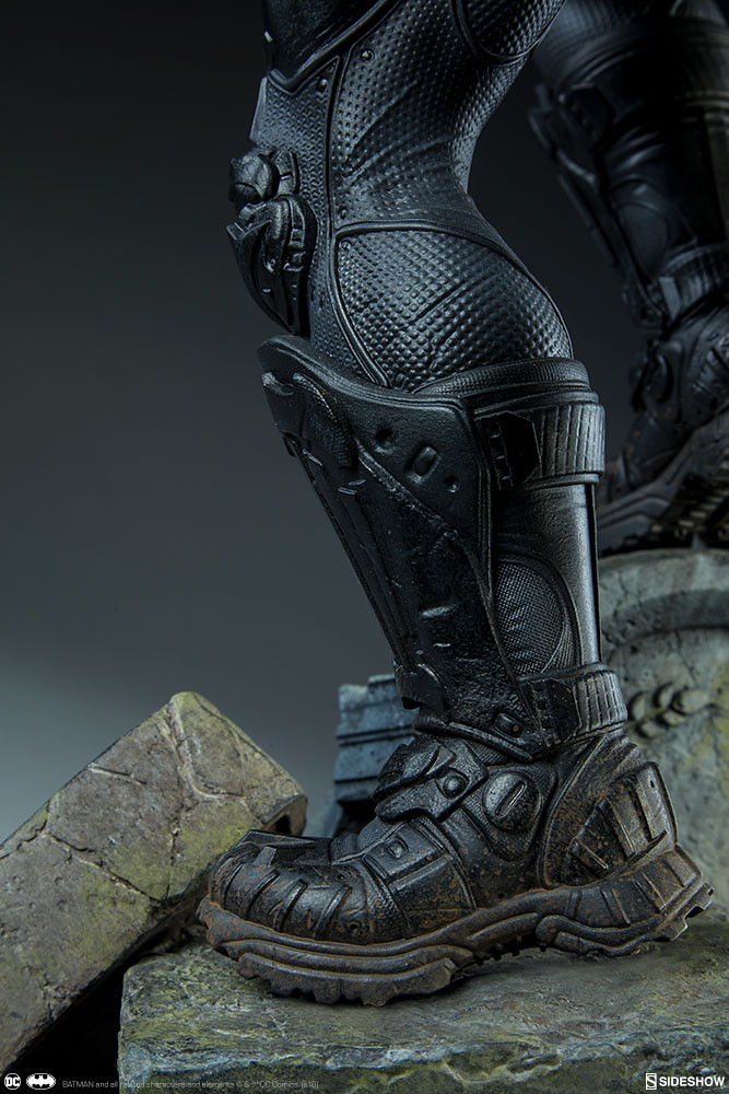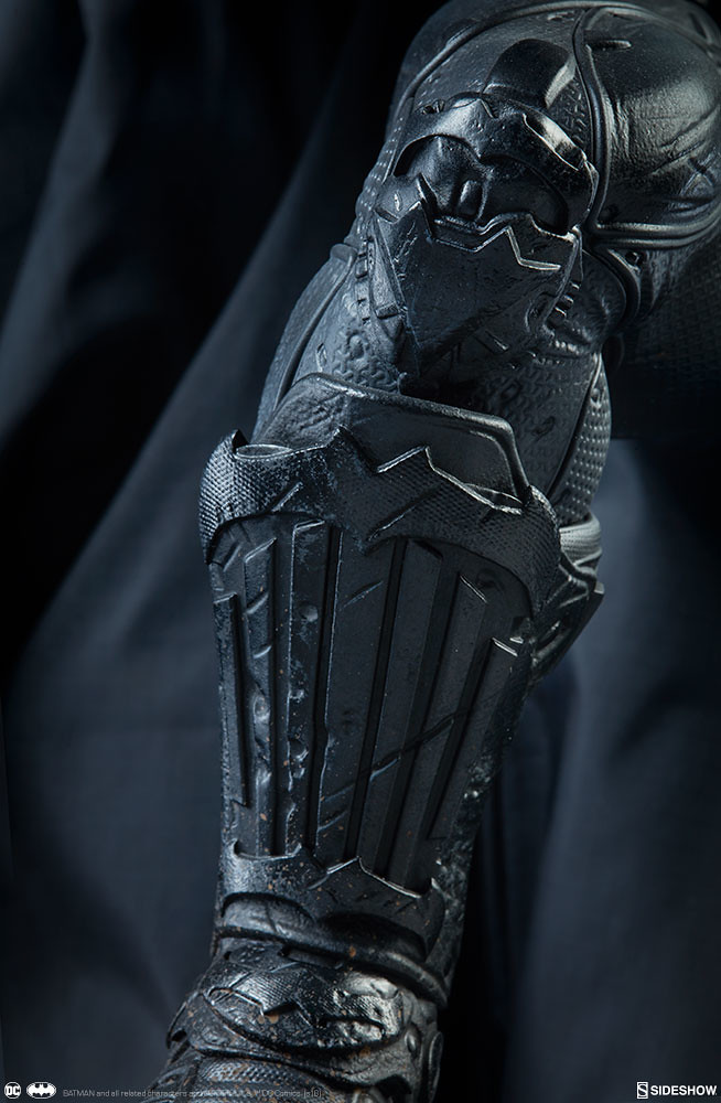 「蝙蝠俠 1/4 比例全身雕像」高約53 公分,呈現出彷彿正凝視著遠方的罪犯,隨時準備好出擊的備戰姿態,從面罩底下露出的臉部來看,不難發現蝙蝠俠飽受歲月風霜的侵蝕,整體給人一種滄桑英雄的氛圍,而佈滿全身盔甲的舊化也恰好呼應了這位黑暗騎士的戰鬥歷史,除了刮痕的戰損處理外,鞋子、護徑濺上泥土的效果塗裝使本作更加寫實,胸、腹部有著誇張的肌肉形狀,四肢尤其腿部也非常壯碩,搭配升級版的裝甲,讓這款蝙蝠俠更具沈重的威壓迫力。