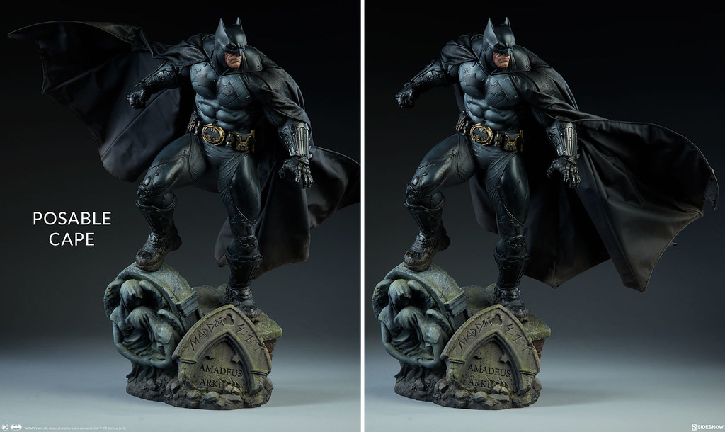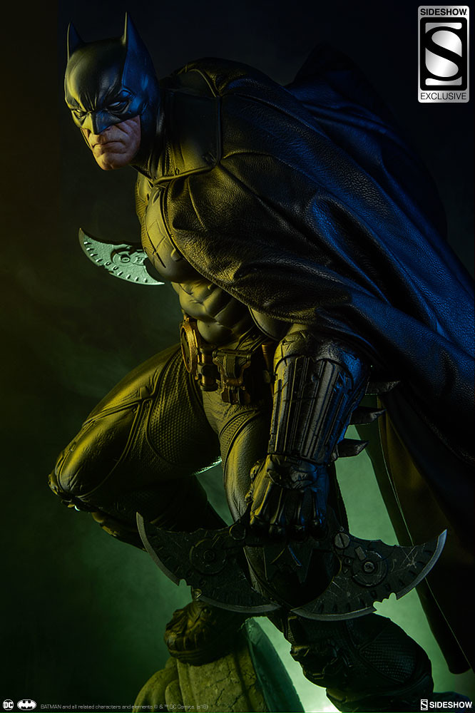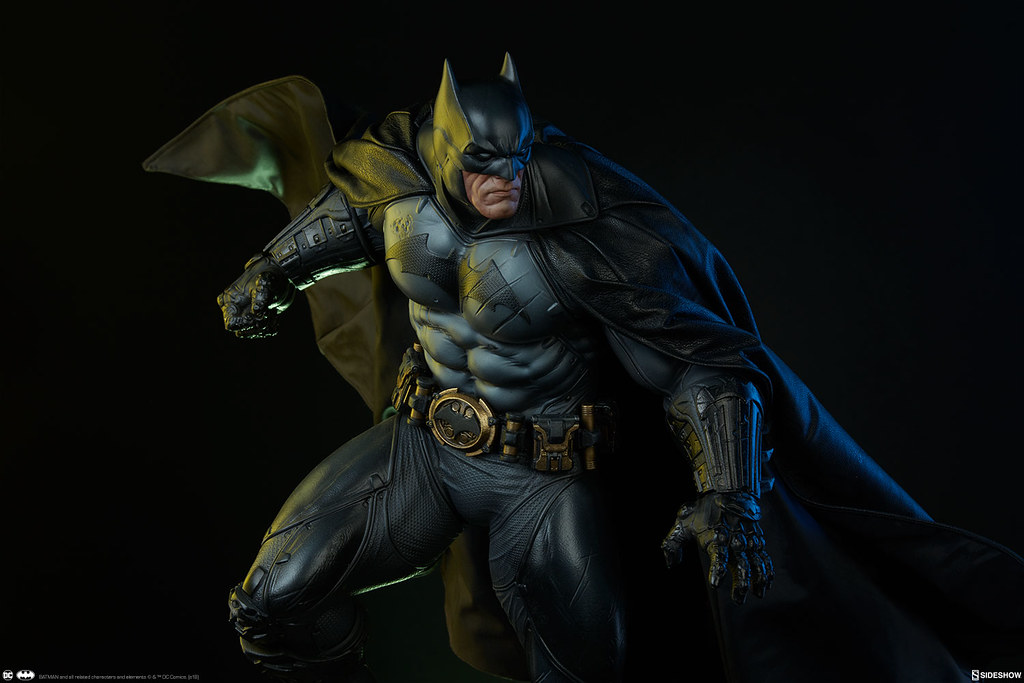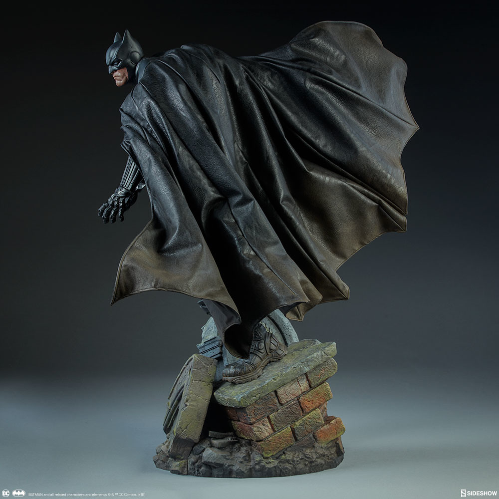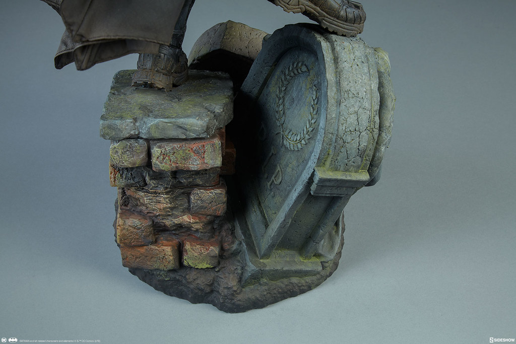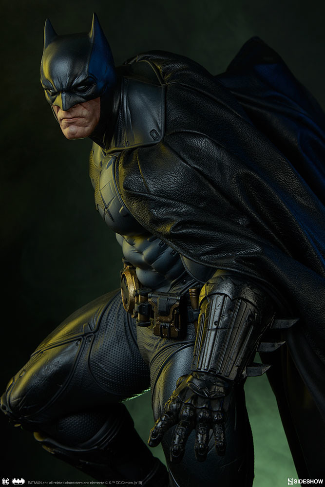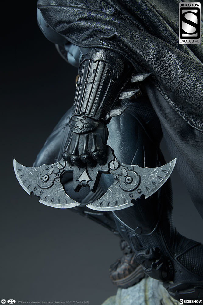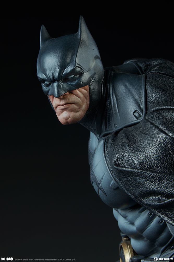 「蝙蝠俠 1/4 比例全身雕像」高約53 公分,呈現出彷彿正凝視著遠方的罪犯,隨時準備好出擊的備戰姿態,從面罩底下露出的臉部來看,不難發現蝙蝠俠飽受歲月風霜的侵蝕,整體給人一種滄桑英雄的氛圍,而佈滿全身盔甲的舊化也恰好呼應了這位黑暗騎士的戰鬥歷史,除了刮痕的戰損處理外,鞋子、護徑濺上泥土的效果塗裝使本作更加寫實,胸、腹部有著誇張的肌肉形狀,四肢尤其腿部也非常壯碩,搭配升級版的裝甲,讓這款蝙蝠俠更具沈重的威壓迫力。
