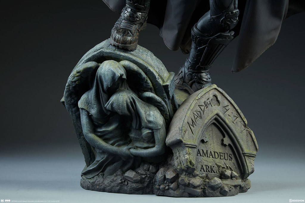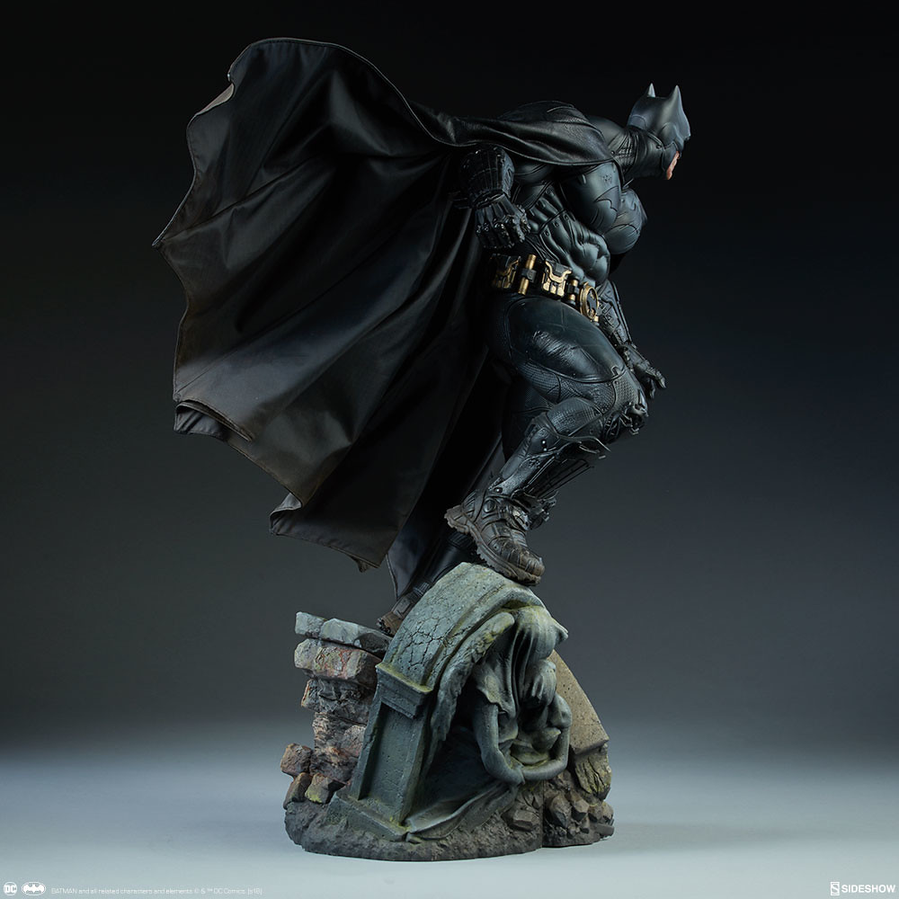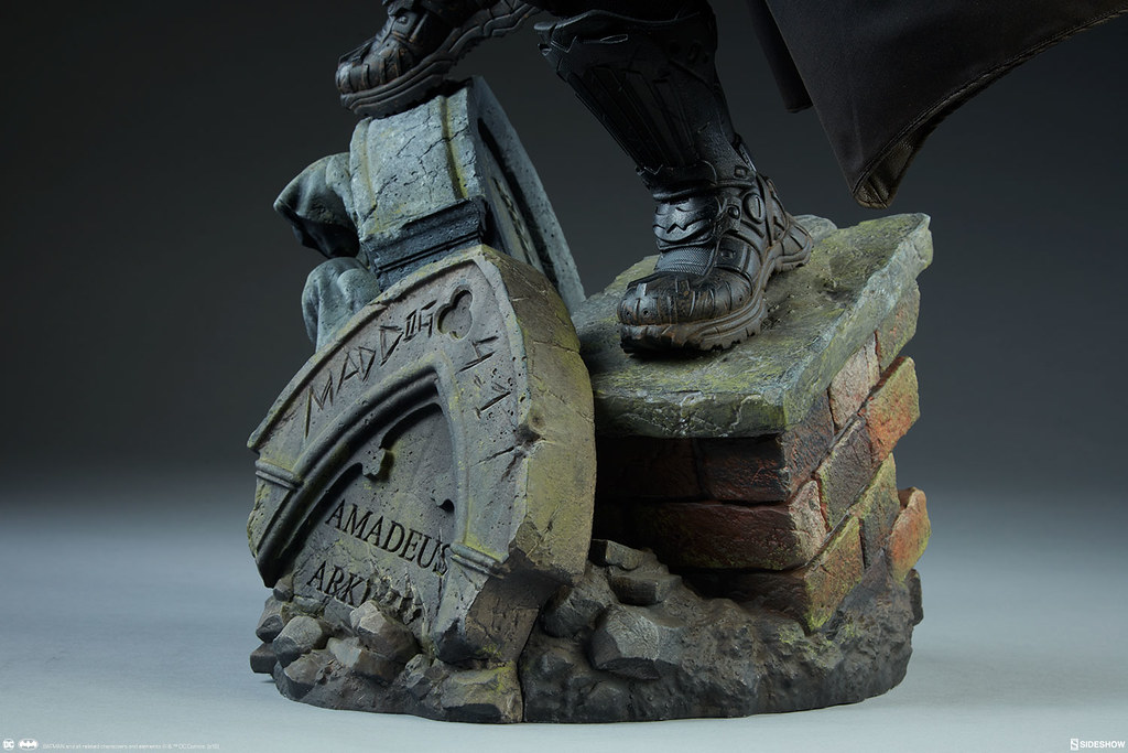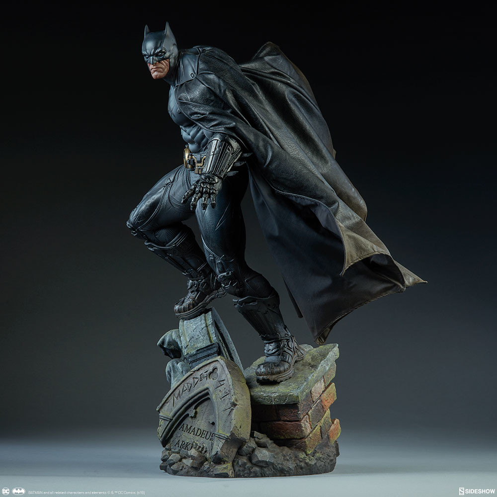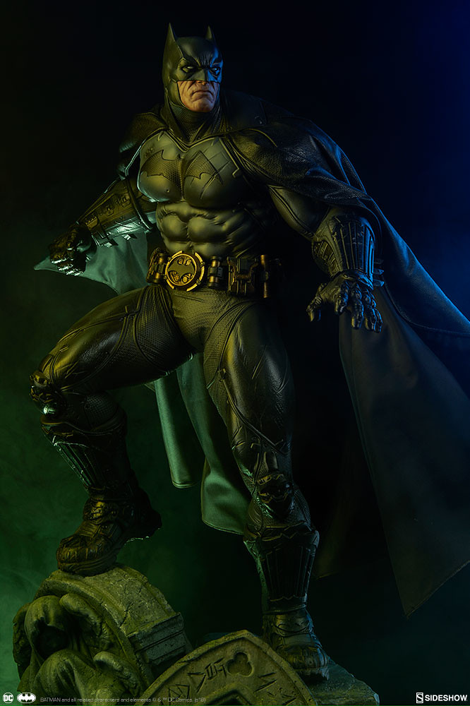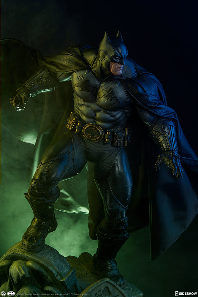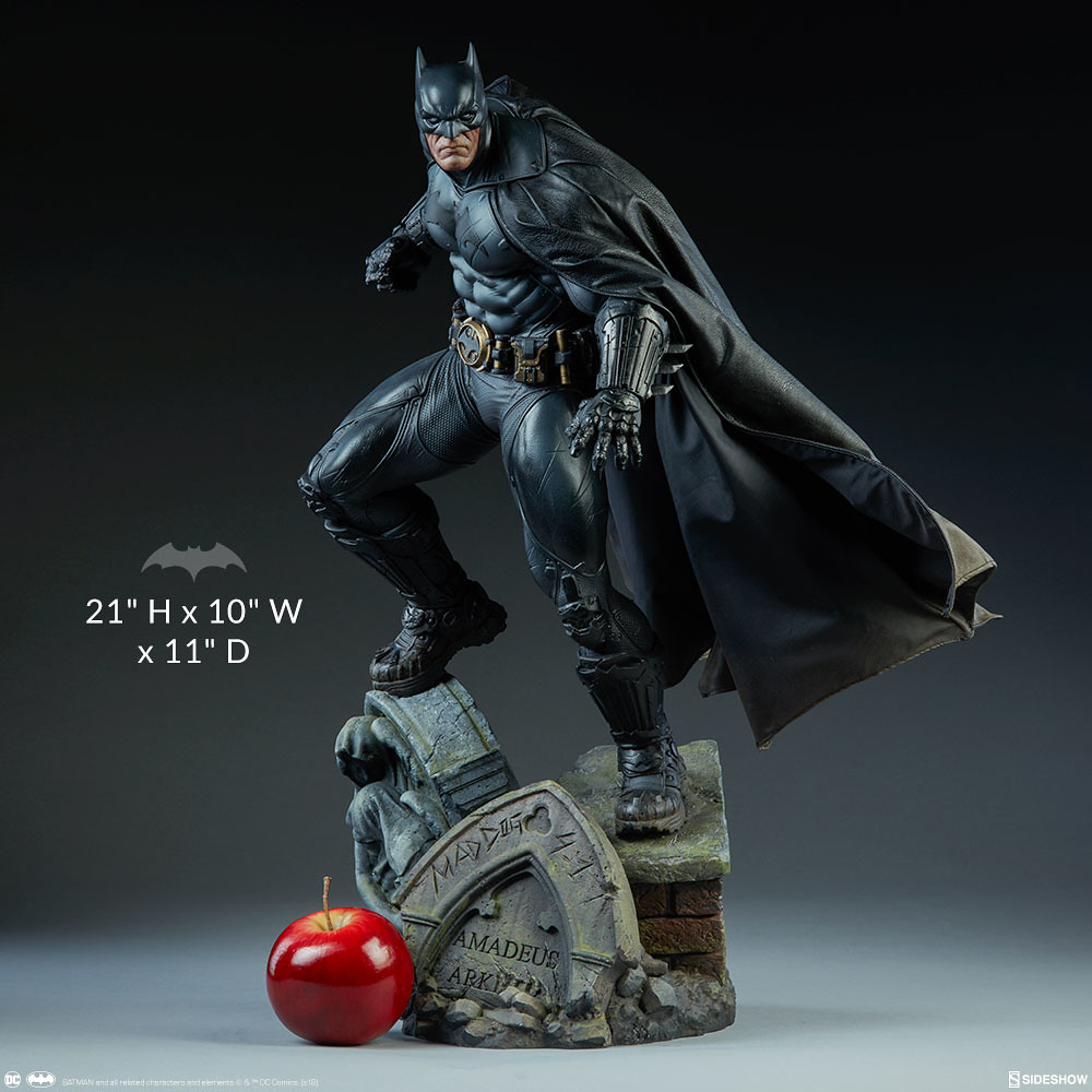 「蝙蝠俠 1/4 比例全身雕像」高約53 公分,呈現出彷彿正凝視著遠方的罪犯,隨時準備好出擊的備戰姿態,從面罩底下露出的臉部來看,不難發現蝙蝠俠飽受歲月風霜的侵蝕,整體給人一種滄桑英雄的氛圍,而佈滿全身盔甲的舊化也恰好呼應了這位黑暗騎士的戰鬥歷史,除了刮痕的戰損處理外,鞋子、護徑濺上泥土的效果塗裝使本作更加寫實,胸、腹部有著誇張的肌肉形狀,四肢尤其腿部也非常壯碩,搭配升級版的裝甲,讓這款蝙蝠俠更具沈重的威壓迫力。