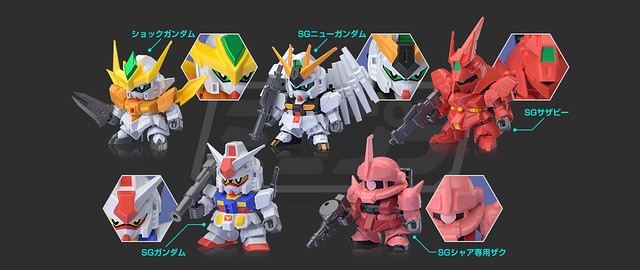 劇中由新黑貓部隊五名成員個別駕駛的SG鋼彈、SG夏亞專用薩克II、SGν(Nu)鋼彈、SG沙薩比、震撼鋼彈是在不讓裝甲變得太薄弱的前提下,盡可能減輕重量增強敏捷度的 SD 機體,再加上體積小讓人難以命中,能夠執行出色的高機動戰術。此外五架SD鋼彈還能像戰隊機器人般,進一步超合體為「超級震撼鋼彈」,裝甲值、火力也都提昇為 5 倍!