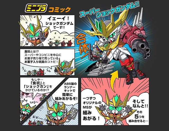 由日本萬代公司食玩事業部「BANDAI CANDY」發行,過去以《超級戰隊》機器人為主的食玩商品「MINIPLA(ミニプラ)」系列,這次將推出來自即將播映的最新動畫《鋼彈創鬥者 潛網大戰》的新機「SUPER SHOCK GUNDAM(スーパーショックガンダム)」,商品預計於 2018 年 07 月發售。