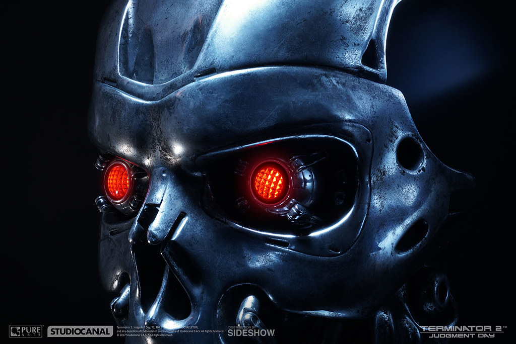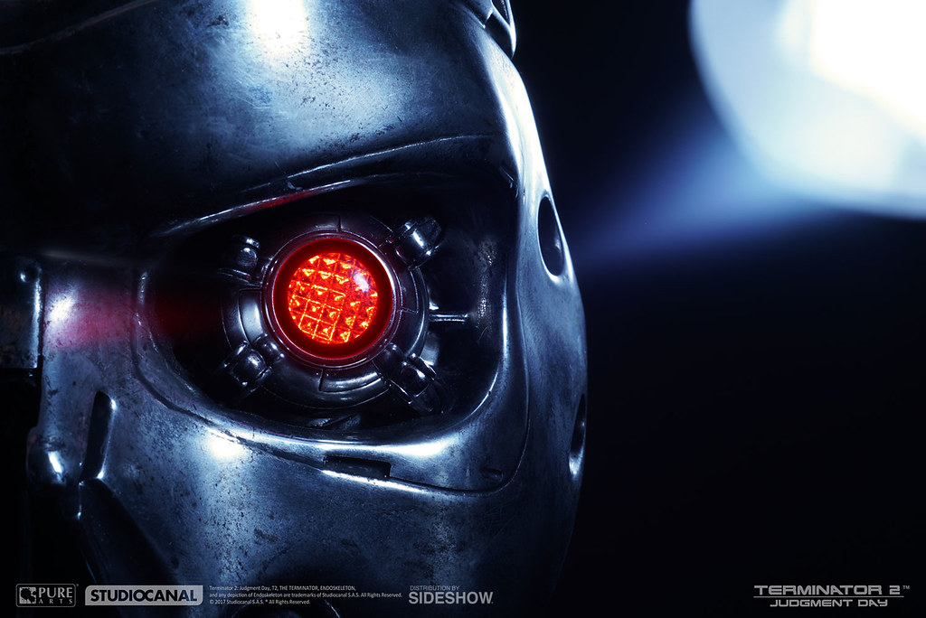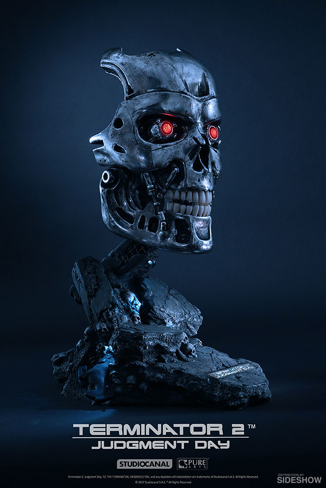 接續第一集的劇情,在刺殺「莎拉·康納」失敗之後,這次天網則是派出了比T-800 更新更強的T-1000 來到1995年,想要殺死莎拉·康納的兒子,未來的人類領袖「約翰·康納」,而人類抵抗軍則是派出了與第一集一模一樣、但是經過改裝的T-800 魔鬼終結者來保護約翰;雖然整體能力不及液態金屬的T-1000,但擁有帥氣內骨骼(Endoskeleton)的T-800 實在相當經典啊!這次兩大廠牌將著重T-800 內骨骼的臉部來推出精美的頭像作品。