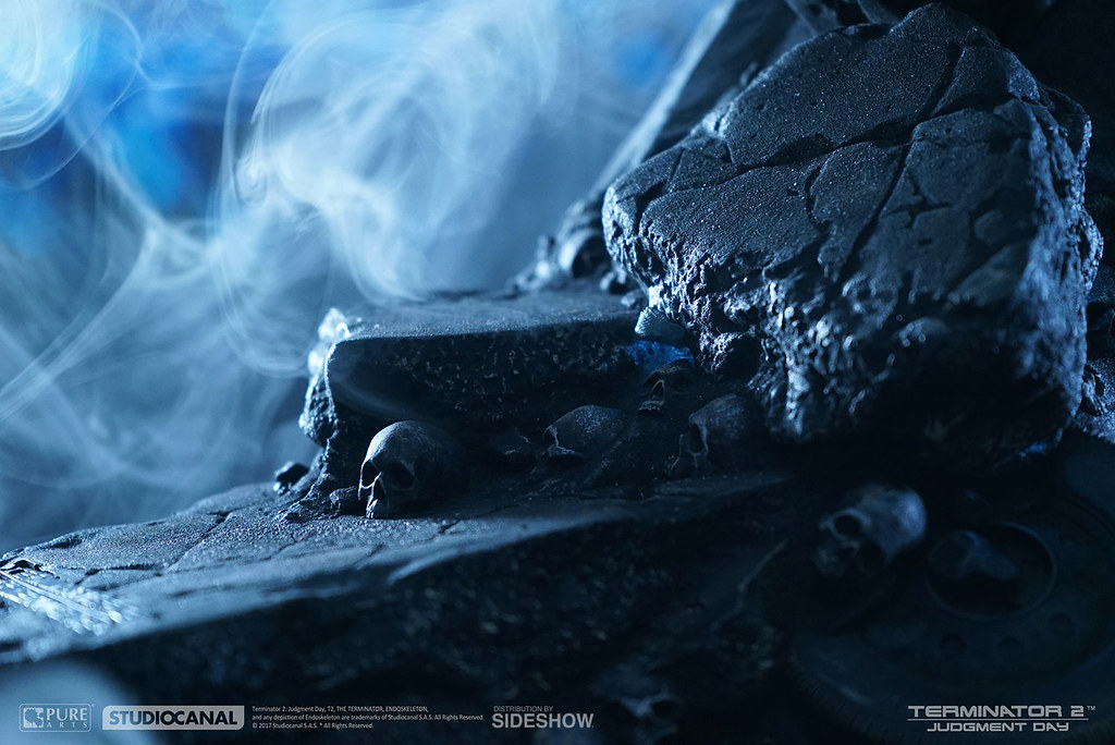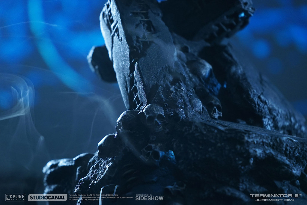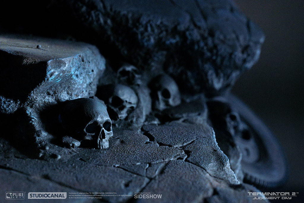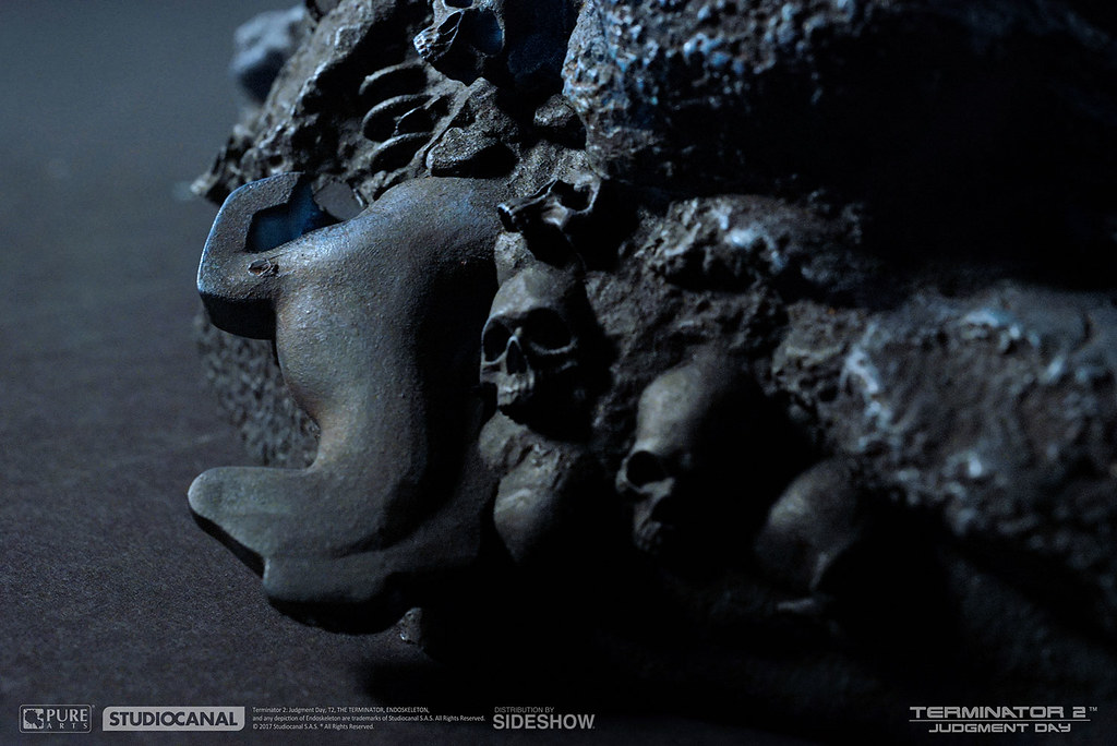 本作全高約45.7 公分,以面具的形式(不可穿戴)呈現,Pure Arts 高水準的製作技術完全再現了T-800 內骨骼的機械結構,金屬厚重感、舊化塗裝讓整體更為寫實,雙眼、地台還搭載了LED 發光功能,地台則是以「審判日(Judgment Day)」為主題設計,碎裂的石塊、機器殘骸,加上大量的頭骨,深刻地傳達出審判日過後人類世界的末日氛圍,帶入感極為強烈;值得一提的是,這款作品除了放置於平面外,也可以掛在牆上展示歐~!
