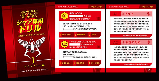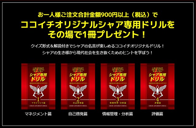 首先呢,只要到「CoCo壱番屋」消費滿 900 日圓(含稅)就能獲得夏亞的「人生哲學問題集」,這套問題集共有「經營管理篇」、「自我啟發篇」、「情報管理・分析篇」、「評價篇」四冊,送完為止。內容是以猜謎、問題形式表現夏亞的名言,解析他生活、工作的處事態度,讓你學習在現代社會中生存的要點,並感受「夏亞.阿茲納布爾」的魅力!
