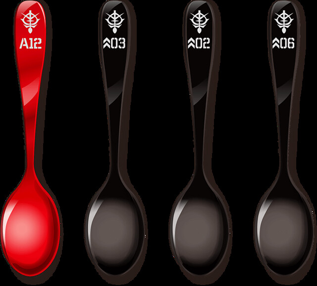 四根全長 18 公分的鋁製湯匙,分別以吉翁公國軍王牌駕駛員「夏亞.阿茲納布爾」、黑色三連星「蓋亞」、「馬修」、「奧爾迪加」為設計,不僅擁有對應的色彩,上面更印製了各自座機的代號!收納紙盒則是以夏亞的個人標誌與黑色三連星標誌設計。