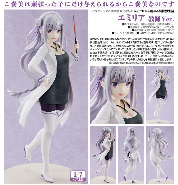 這次由日角川(KADOKAWA)以《RE:從零開始的異世界生活》OVA版本為題材,將推出女主角「愛蜜莉雅 教師服裝版本(エミリア 教師VER.)」的立體造型作品,官網近日公開其宣傳照片以及販售相關資訊。這次以原作小說導讀本封面的造型來呈現,身上穿著白色外套以及深色貼身裙教師的姿態來推出1/7比例上色完成品,白色外套下面包覆著若隱若現好身材的貼身裙,喜愛《RE:從零開始的異世界生活》系列的玩具人千萬別錯過了啊!