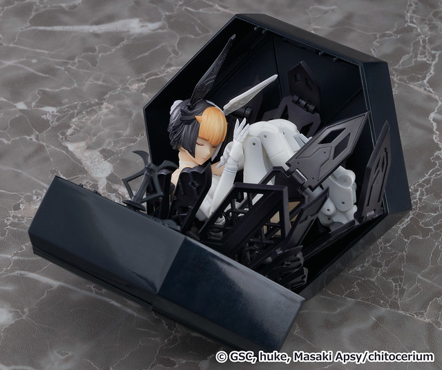 「chitocerium LXXVIII-platinum」套件擁有完整的成形色,部份零件已塗裝完成,收錄了標誌貼紙與普通臉、閉眼臉、微笑臉三種表情零件,約 20 公分的嬌小身軀具備廣域可動範圍,能做出人偶般可愛的細膩動作,或像妖精般展開武裝優雅飛舞。收納可折疊的裝甲後,蜷曲的素體可完整收納至如寶石盒般的六角形底座中,相當美麗。