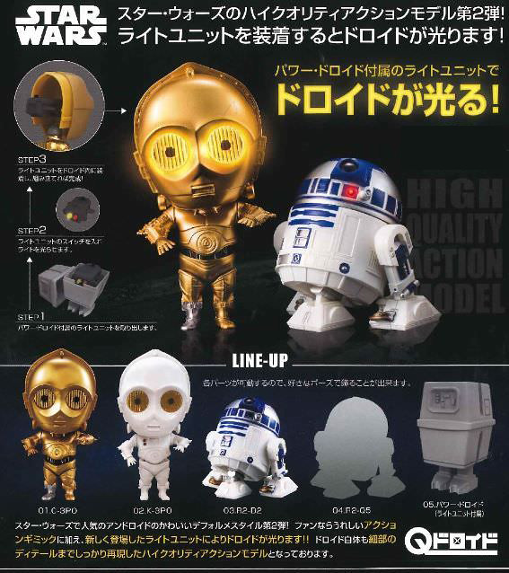 2018年7月3日新增官方宣傳照片以及販售相關資訊,將增加有Led燈的發光設計,預計將會收錄有「C-3PO」與第一彈的小腿部份是白色式樣不同,白色的「K-3PO」、「R2-D2」以及還沒公開的黑色「R2-Q2」,還有雙足移動的「動力機器人(パワードロイド)」等等五種類可以收集,喜愛《星際大戰》系列的玩具人可以參考一下歐!