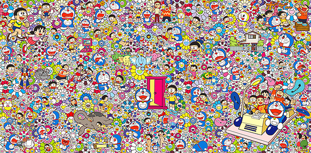 ▼ 由村上隆設計的「THE 哆啦A夢展 TOKYO 2017」主視覺圖『あんなこといいな 出来たらいいな』,作中眾多的角色、場景都被村上隆的代表作「微笑花朵」圖騰所包圍。
