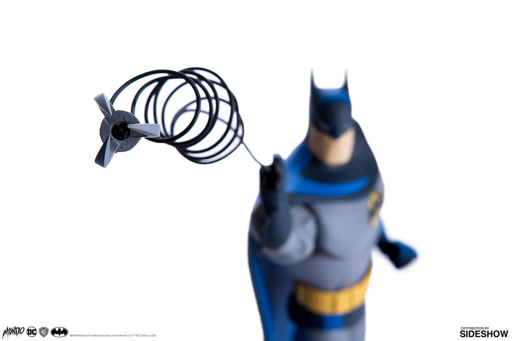 「蝙蝠俠 動畫版 1/6 比例人偶」全身擁有30 處可動關節,忠實地還原了蝙蝠俠的服裝造型和倒三角的壯碩體態,在塗裝部分也有鮮明的動畫風格相當令人懷念啊~頭雕一共包含普通、咬牙、微笑三種表情,配件內容也非常豐富,除了有招牌武器蝙蝠飛鏢之外,鉤爪槍也有兩種型態可以替換,再搭配潛水呼吸罩、多個替換手型即可再現許多動畫中的經典姿態!