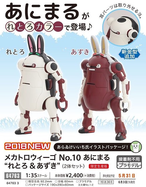 3DCG建模師也是原型師小林和史所設計的35機動機器人WeGo「35Mechatro WeGo」,相當受到喜愛機械題材的玩具人喜愛,之前由「長谷川」玩具公司所推出過的"1/35比例組裝模型"、"東雲研究所ver."與"光&黑影版本",後來還推出由人氣投票得"第1位"作品「機械動力手臂」、「紫色&粉紅色」、「白色&藍色」以及「透明感蜜瓜&透明感檸檬」的塗裝版本都頗受模型玩具人們的歡迎,這次將繼續以人氣投票上位的"動物(あにまる)"主題來推出「懐古&紅豆(“れとろ&あずき”)」(名稱暫譯)兩款新配色的系列續作。