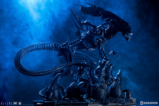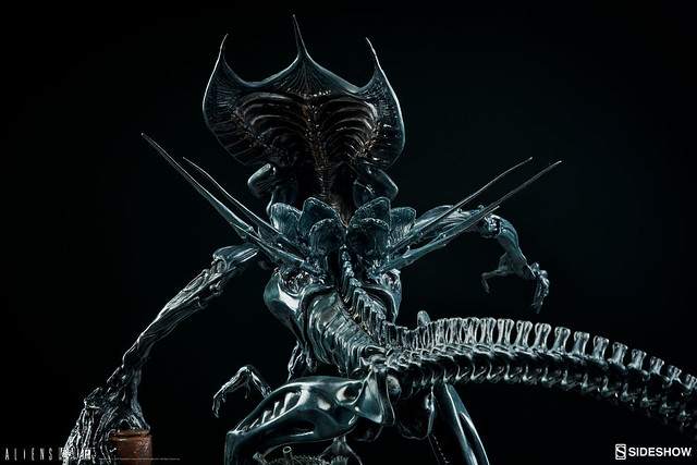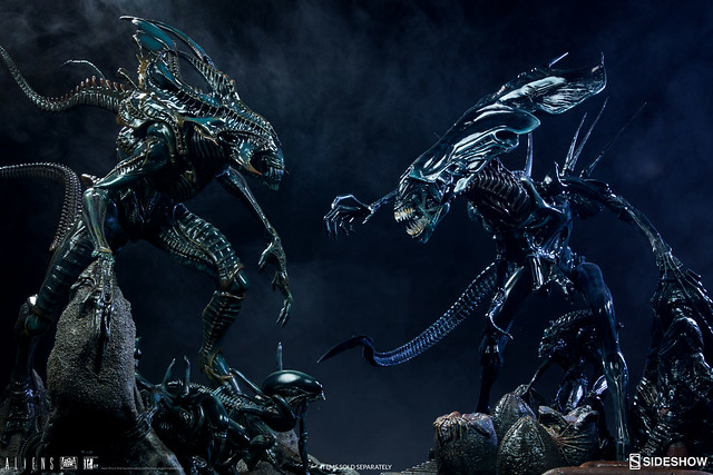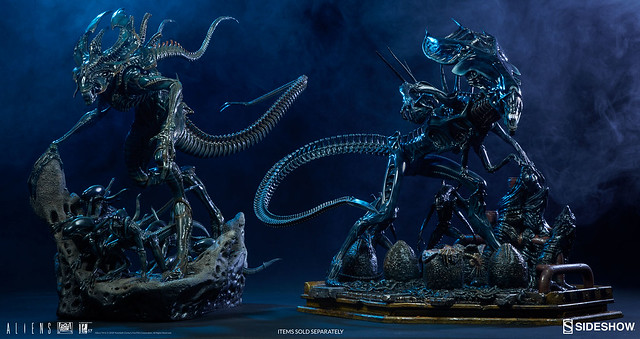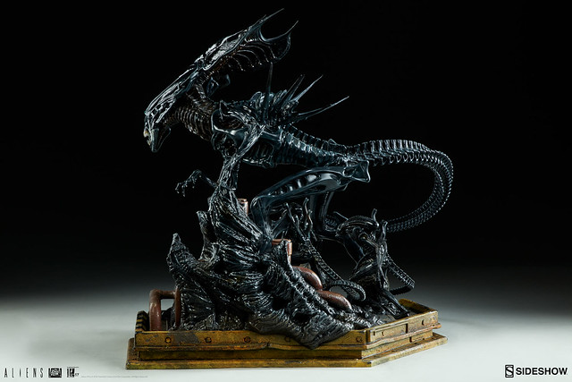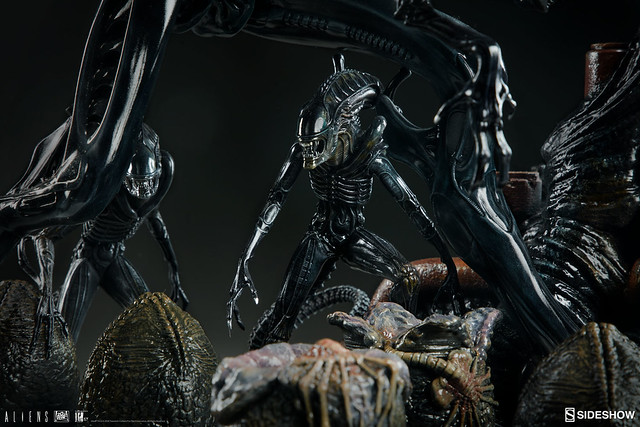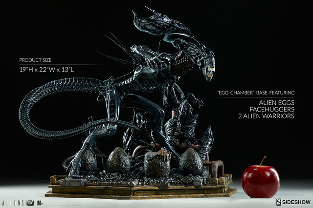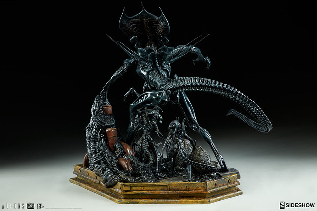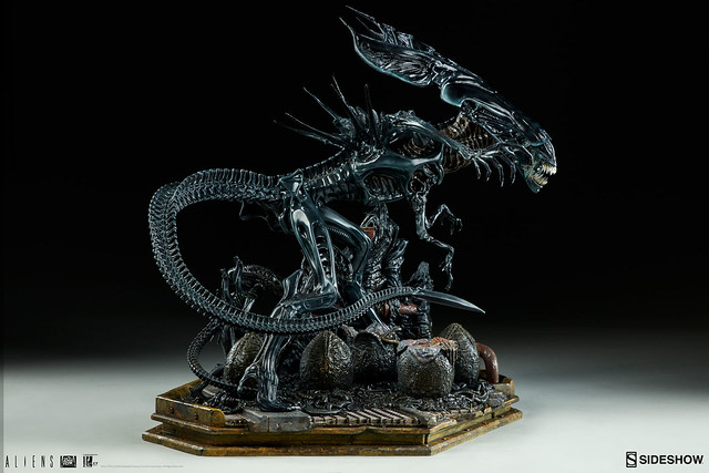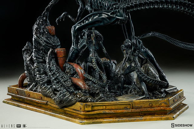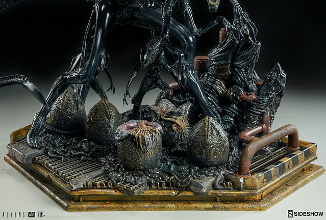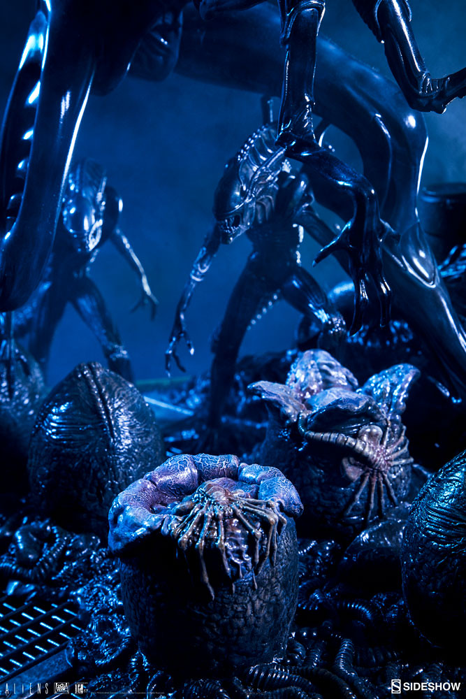本作高約48 公分,以整個巢穴為主題設計,並讓女王呈現出蓄勢待發的姿態相當駭人,最讓人驚喜(或驚嚇)的是這款作品根本就是「異形豪華拼盤」,除了搶眼的女王之外,還有兩隻異形戰士、滿滿的異形蛋,而且還有已經打開、露出抱臉體的型態,全都考究地還原電影造型,基地建物也有寫實的舊化,搭配地上一大片黏稠的物質,真的是超噁爛又不得不讚嘆其極為逼真的質感,精緻的造型、豐富的場景內容、強烈的故事性,絕對值得膽子大的異形鐵粉收藏啊!
