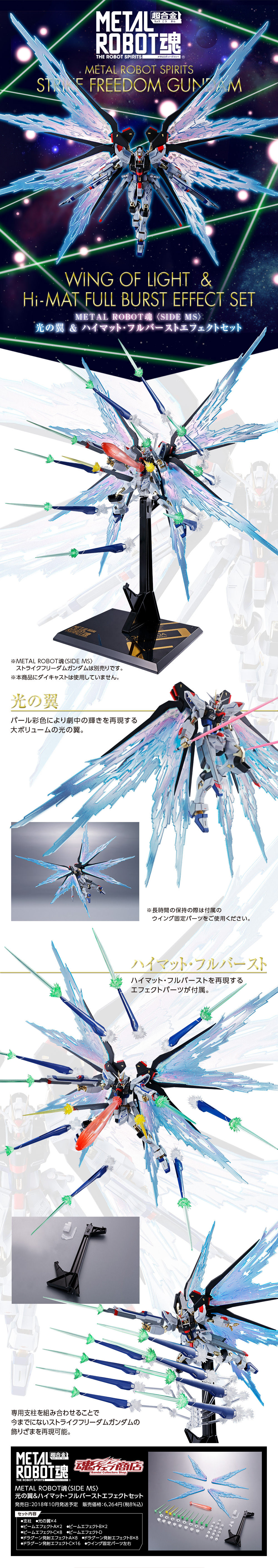 既然推出攻擊自由鋼彈,BANDAI 就不可能放過用光之翼特效再賺一波的機會!由日本 BANDAI SPIRITS 公司收藏事業部「TAMASHII NATIONS」發行,結合厚重金屬質感、高度造型力、可動結構的『METAL ROBOT魂』系列今(12)日發表了可供「METAL ROBOT魂〈SIDE MS〉攻擊自由鋼彈」使用的最新商品「光之翼&一齊射擊特效零件組」預計於 2018 年 10 月發售的消息。