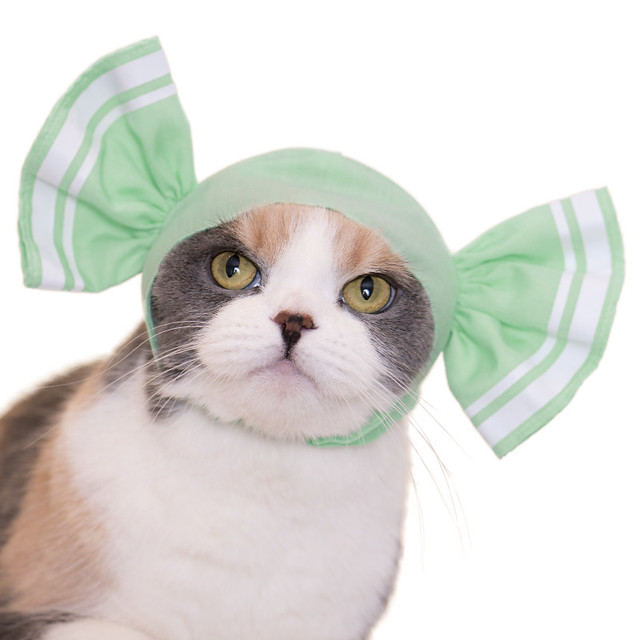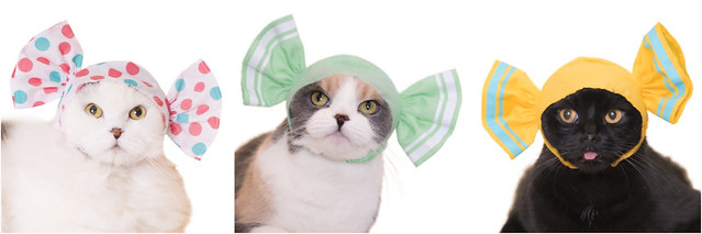 在被扮成各種顏色的花朵、一顆又一顆大大的愛心、可愛又可口的野菜,以及上次的復活節吉祥物「復活節兔」和「復活節彩蛋」之後,各位鏟屎官這次能將貓兒變成一個又一個繽紛的大糖果貓貓!絕對會勾起玩具人們在零食店挑選糖果的回憶吧~不同的包裝紙同時也代表了五花八門的味道,當然這款頭套是沒辦法拉著兩邊就自動轉開,但把各種顏色的糖果包裝紙頭套戴在貓咪身上真的很有趣,而且這也是本系列首次以零食為主題的作品歐~