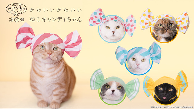 日本搞怪轉蛋廠牌奇譚俱樂部旗下超熱門的「可愛貓咪頭套」系列轉蛋在第15彈「花朵版」、第16彈「愛心版」、第17彈「野菜版」、第18彈「復活節版」之後,看起來甜滋滋的第19彈「可愛貓咪頭套。糖果貓」(かわいい かわいい ねこキャンディちゃん)也可口登場啦~預計將於2018年4月下旬發售!!