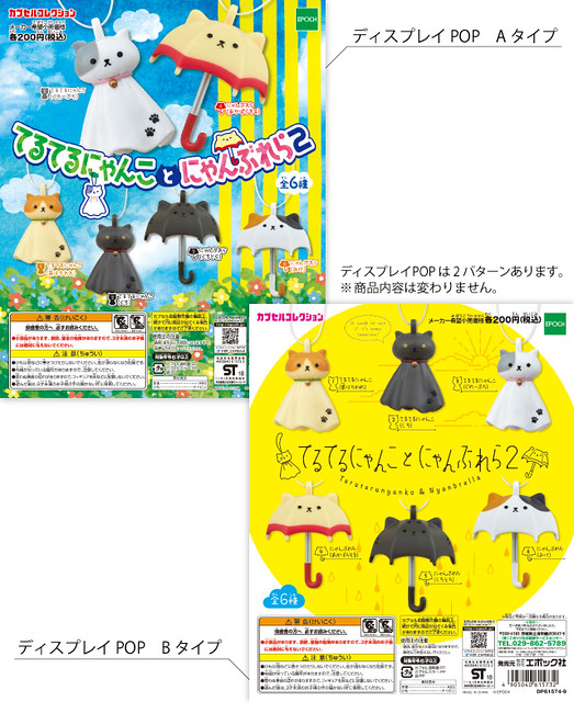 推出多款趣味貓咪題材轉蛋商品的Epoch(エポック)品牌,之前推出超多款"貓咪"題材轉蛋作品,像是「脫力貓」、「打擾貓」、「太貓」、「吾輩の定位置」、「貓的美容」、「貓咪俄羅斯套娃」、「貓咪的美容」、「貓咪的美容 寒冷的下午篇」、「貓咪遊戲組」、「貓和紙板坦克」與「貓咪小幫手」等等相當多款的貓咪題材的轉蛋作品,每款可都頗受愛貓咪的玩具人們歡迎,之前也推出過一款「貓咪晴天娃娃&貓傘(てるてるにゃんことにゃんぶれら)」(名稱暫譯),這個月份將推出"第二彈"系列的續作品。