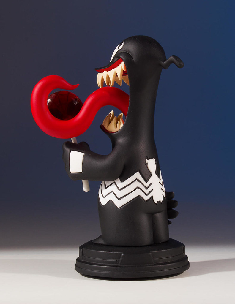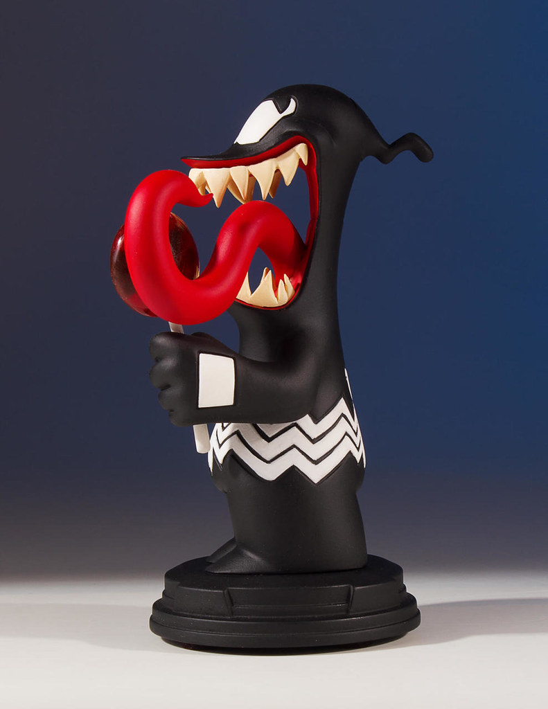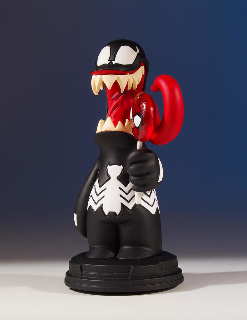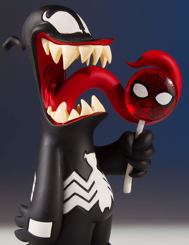 「猛毒 Animated Statue」是根據Venom #150 的特別版漫畫封面來製作,向來強大、帥氣的猛毒在這裡瞬間變成了四隻肥短、張開大嘴,舔著棒棒糖的小屁孩,極其誇張的牙齒、舌頭更是完美地被展現出來,而本作最大的亮點就是棒棒糖採用了「友善好鄰居」的圖樣,半透明的質感也超讚,不知道嚐起來味道是不是很彼得呢?與一般霸氣、恐怖的猛毒擁有截然不同的風格,趣味十足的造型加上細緻的手工上色,絕對值得漫畫迷收藏啊~!!