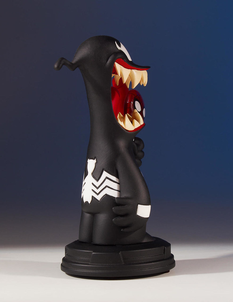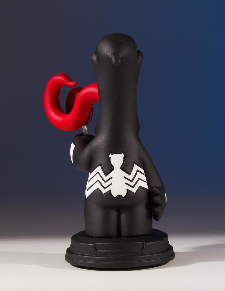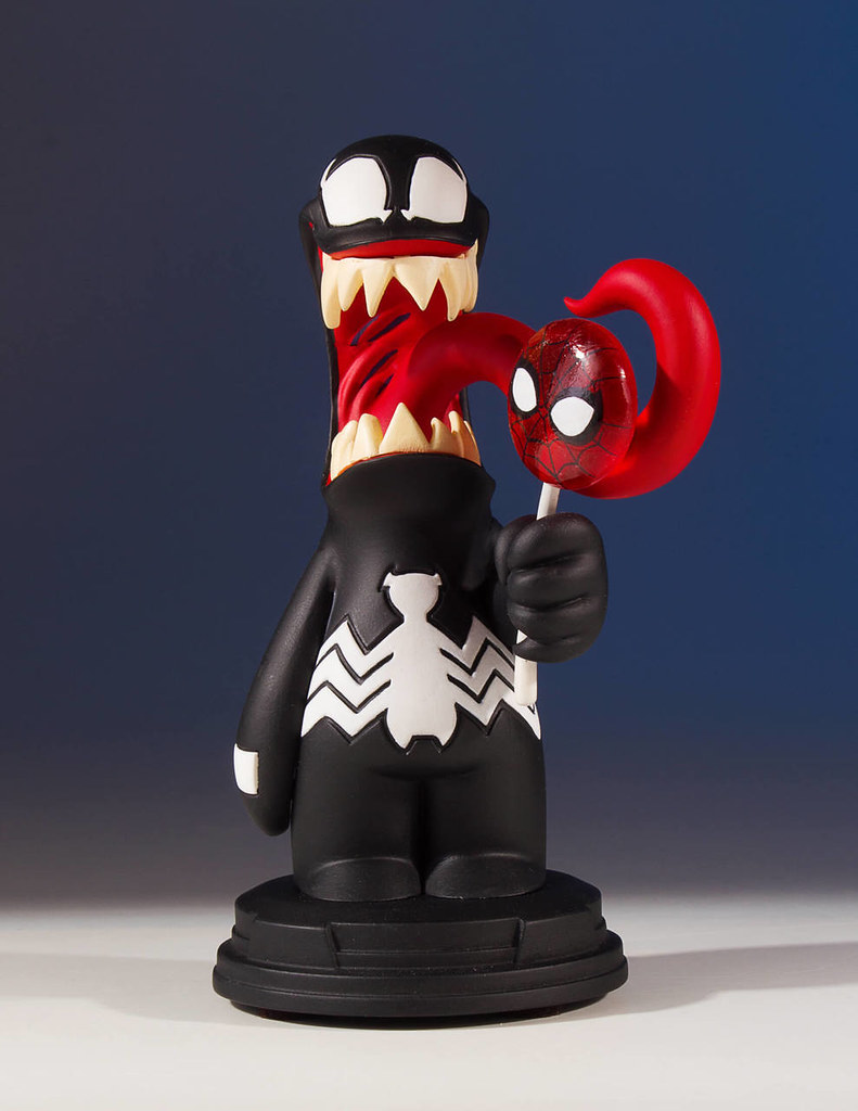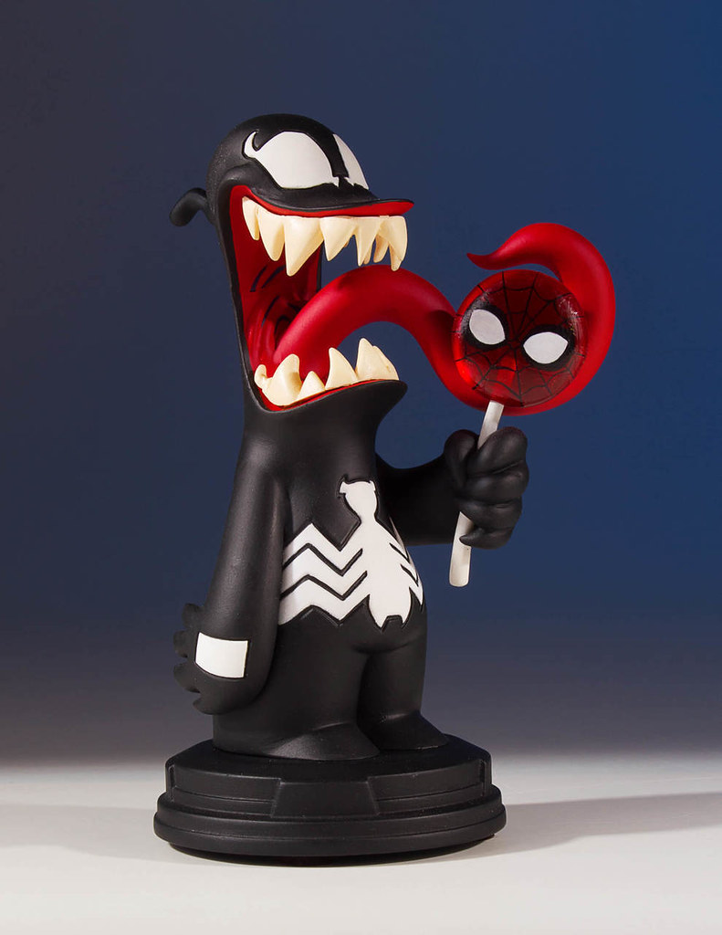 「猛毒 Animated Statue」是根據Venom #150 的特別版漫畫封面來製作,向來強大、帥氣的猛毒在這裡瞬間變成了四隻肥短、張開大嘴,舔著棒棒糖的小屁孩,極其誇張的牙齒、舌頭更是完美地被展現出來,而本作最大的亮點就是棒棒糖採用了「友善好鄰居」的圖樣,半透明的質感也超讚,不知道嚐起來味道是不是很彼得呢?與一般霸氣、恐怖的猛毒擁有截然不同的風格,趣味十足的造型加上細緻的手工上色,絕對值得漫畫迷收藏啊~!!