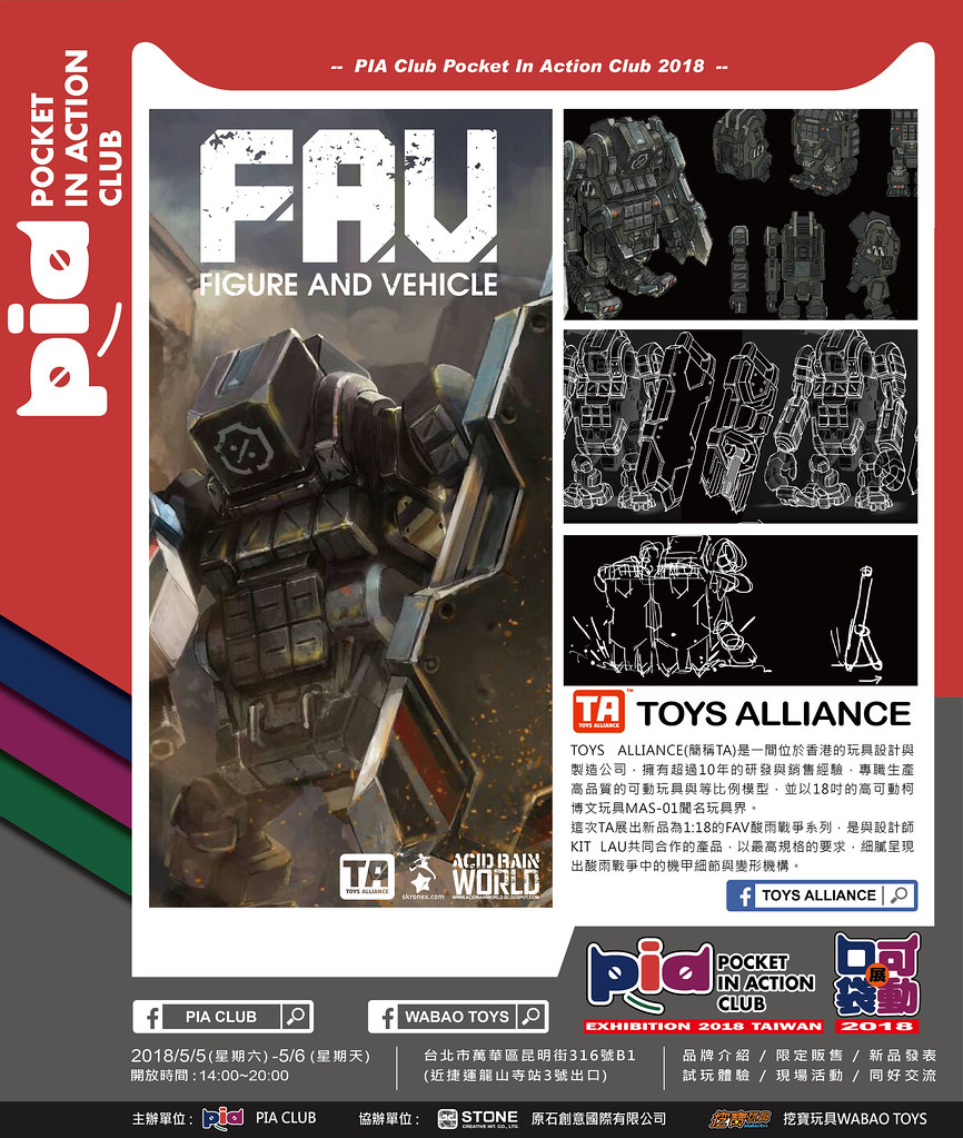 以「Mega Action」18吋巨大變形金剛系列聞名的「Toys Alliance」,這次帶來了全新系列「FAV Figure And Vehicle」! 這是與「Acid Rain酸雨戰爭」合作的全新組合,比例為1/18,現場有重裝人型機甲首次曝光,與粉絲怨念已久的摩托車、砲車與南瓜車試模!