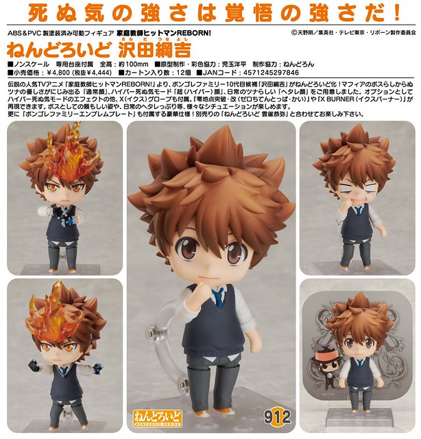 知名日廠Good Smile Company好微笑玩具公司暢銷熱賣的Q版「黏土人」(ねんどろいど)玩具系列,這次將以大人氣TV動畫《家庭教師HITMAN REBORN!》為題材,來推出故事裡面彭哥列家族的第10代頭目候選人「澤田綱吉」的黏土人作品,近日公開其宣傳照片與販售相關資訊,此次作品附有不像黑手黨首領的溫柔「普通臉」、超死氣模式的「超級臉」以及他日常般的「膽小臉」等等三款不同表情配件。